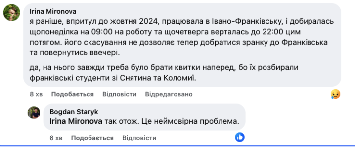 Скасування потяга не дозволяє тепер добратися зранку до Франківська та повернутись ввечері