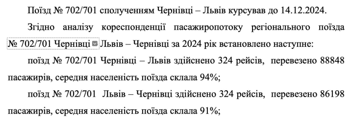 Відповідь на запит до Укрзалізниці щодо заселеності скасованого потягу 701/702 Львів-Чернівці у 2024 році.