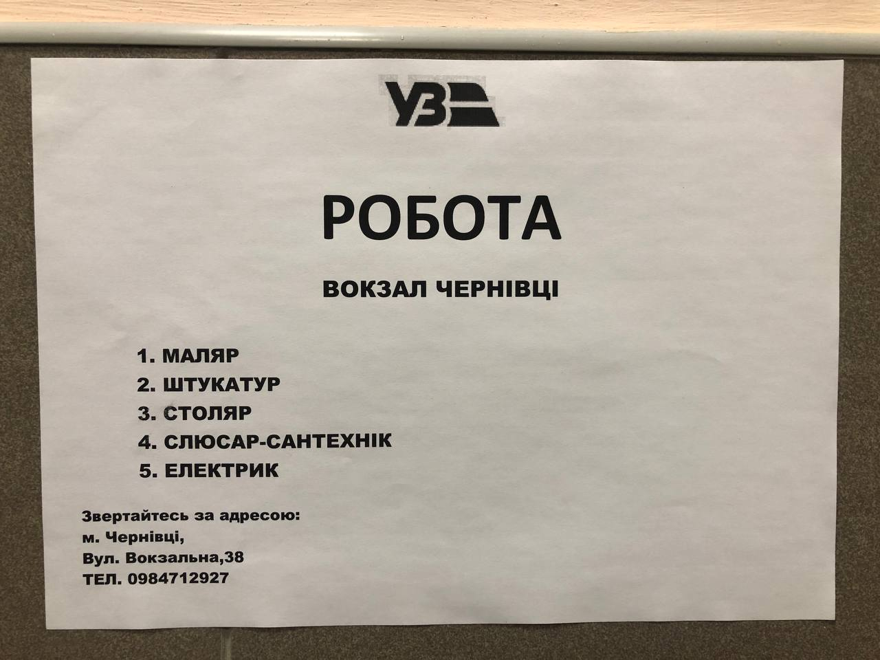 Залізничний вокзал Чернівців шукає працівників. Відповідне оголошення містить вакансії електрика, маляра, штукатура, слюсаря-сантехніка та столяра.