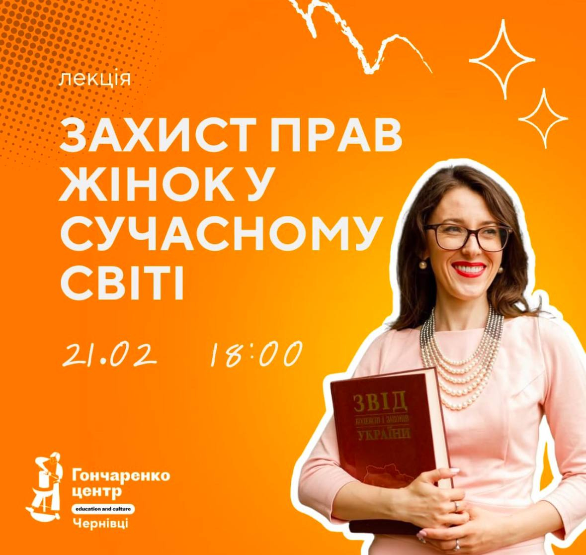 21 лютого о 18:00 в Гончаренко центрі у Чернівцях відбудеться лекція, присвячена актуальній темі – захисту прав жінок у сучасному світі.