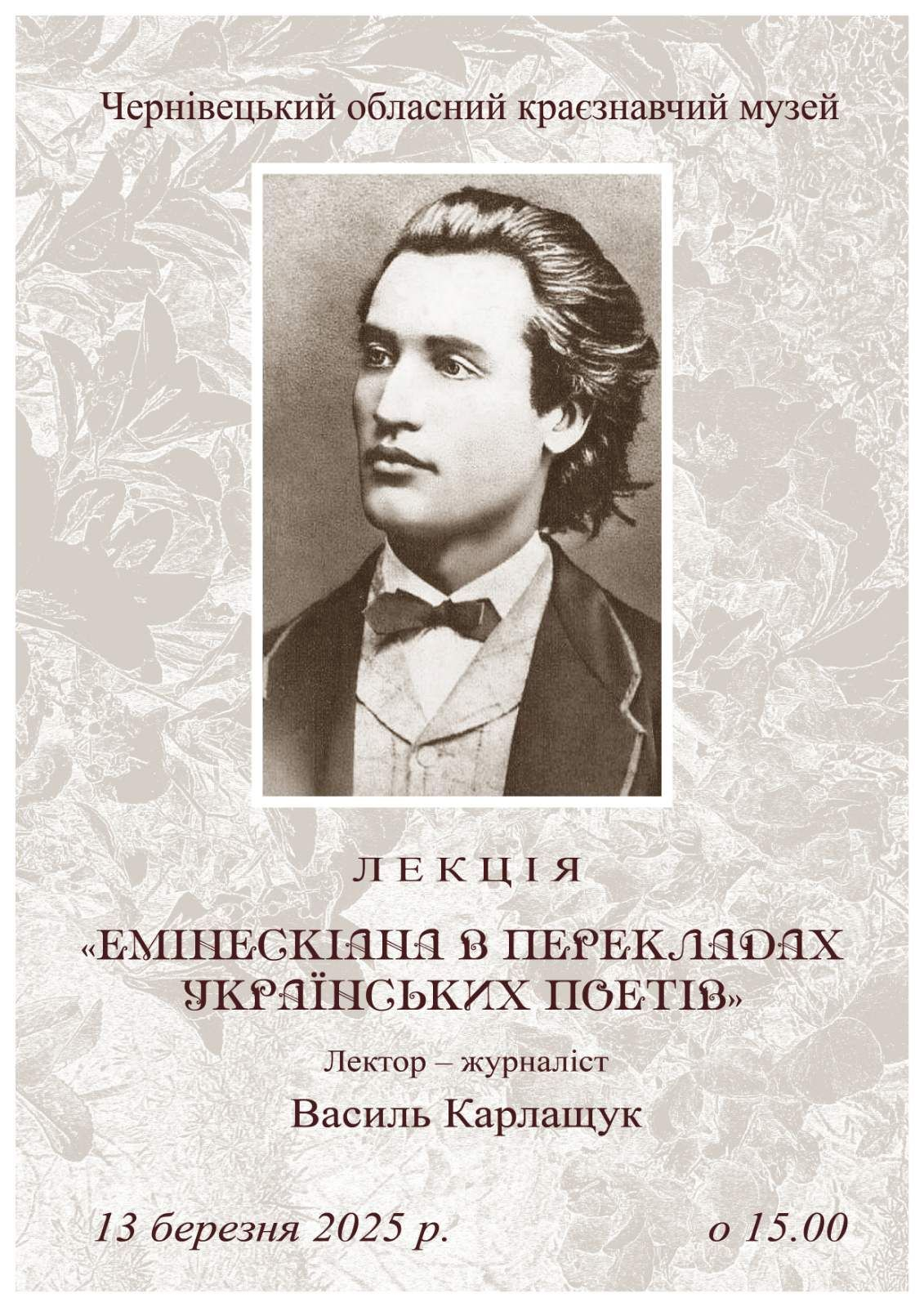 13 березня о 15:00 усіх бажаючих запрошують до Чернівецького обласного краєзнавчого музею на лекцію радіожурналіста Василя Карлащука «ЕМІНЕСКІАНА В ПЕРЕКЛАДАХ УКРАЇНСЬКИХ ПОЕТІВ», до 175-річчя від дня народження Міхая Емінеску.