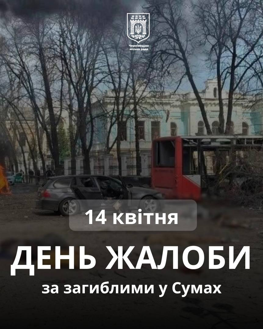 "У памʼять про невинно вбитих українців у місті Суми — нашому місті-побратимі, що постраждало від жорстокої російської атаки, в Чернівцях 14 квітня оголошено День жалоби.