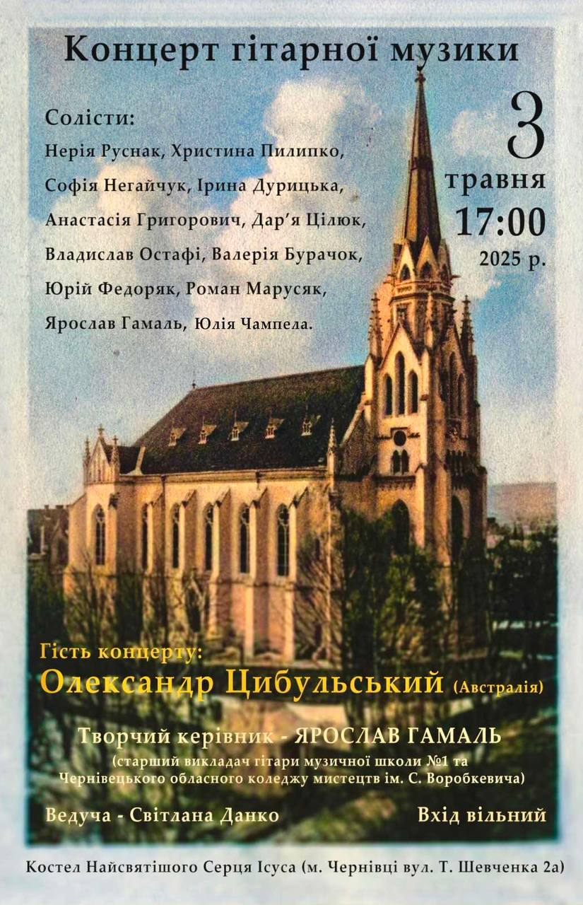 В суботу о 17:00 в костелі Серця Ісуса відбудеться концерт класичної гітарної музики. Виконавці концерту - це талановиті Чернівецькі музиканти в більшості студенти коледжу мистецтв ім. Сидора Воробкевича.