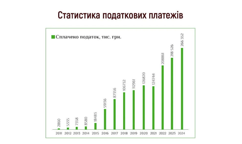 Висококваліфікований колектив – це стабільна робота підприємства і розвиток, це якість продукції, яку щороку обирають все більше споживачів. Як наслідок – результат: 266 млн грн податків, які торік сплатило ТОВ «Пивоварня «Опілля». Це на 52 млн більше ніж в 2023 році. В 2025-му плануємо досягти суми 300 млн грн податків.