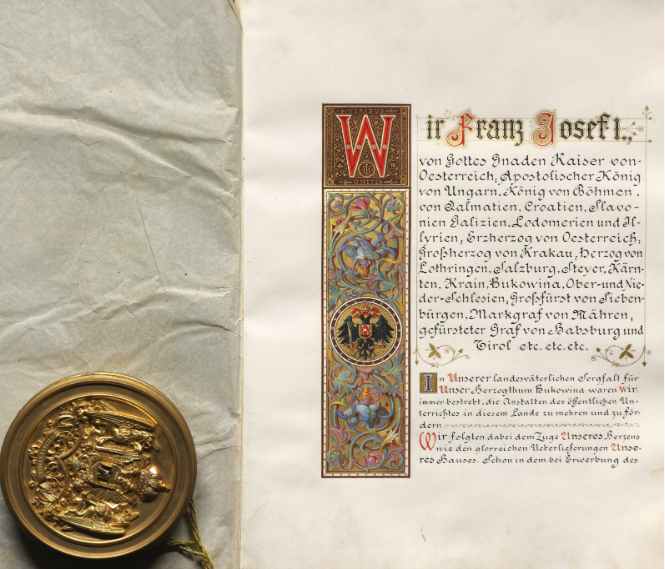 Грамота австрійського цісаря Франца Йосифа про відкриття Чернівецького університету. Рукопис на пергаменті, 30 вересня 1875 рік.