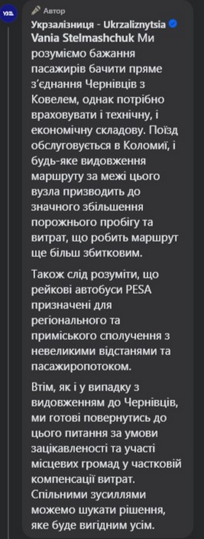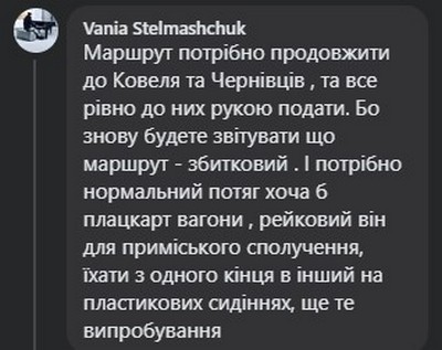 Втім, як і у випадку з видовженням до Чернівців, ми готові повернутись до цього питання за умови зацікавленості та участі місцевих громад у частковій компенсації витрат. Спільними зусиллями можемо шукати рішення, яке буде вигідним усім», - зазначили в Укрзалізниці.