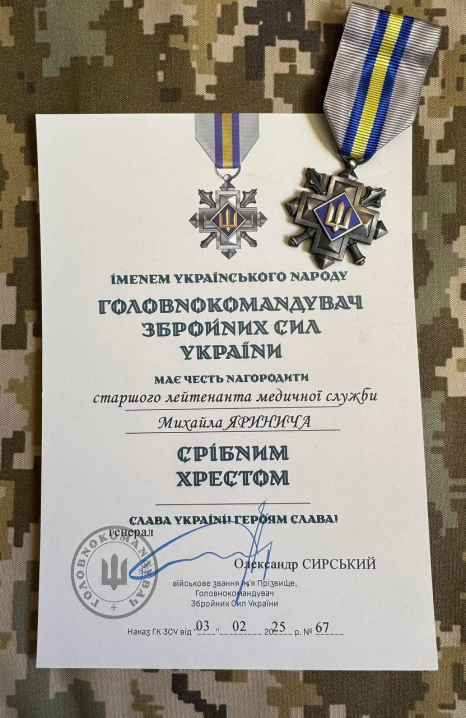 У березні 2025 року за вагомий внесок в організацію медичної евакуації поранених, роботу стабілізаційних пунктів і польового госпіталю, а також за ухвалення рішень у стресових ситуаціях, що дозволило врятувати життя побратимів, старший лейтенант Михайло Яринич був удостоєний почесної відзнаки «Срібний хрест» від Головнокомандувача Збройних Сил України Олександра Сирського.