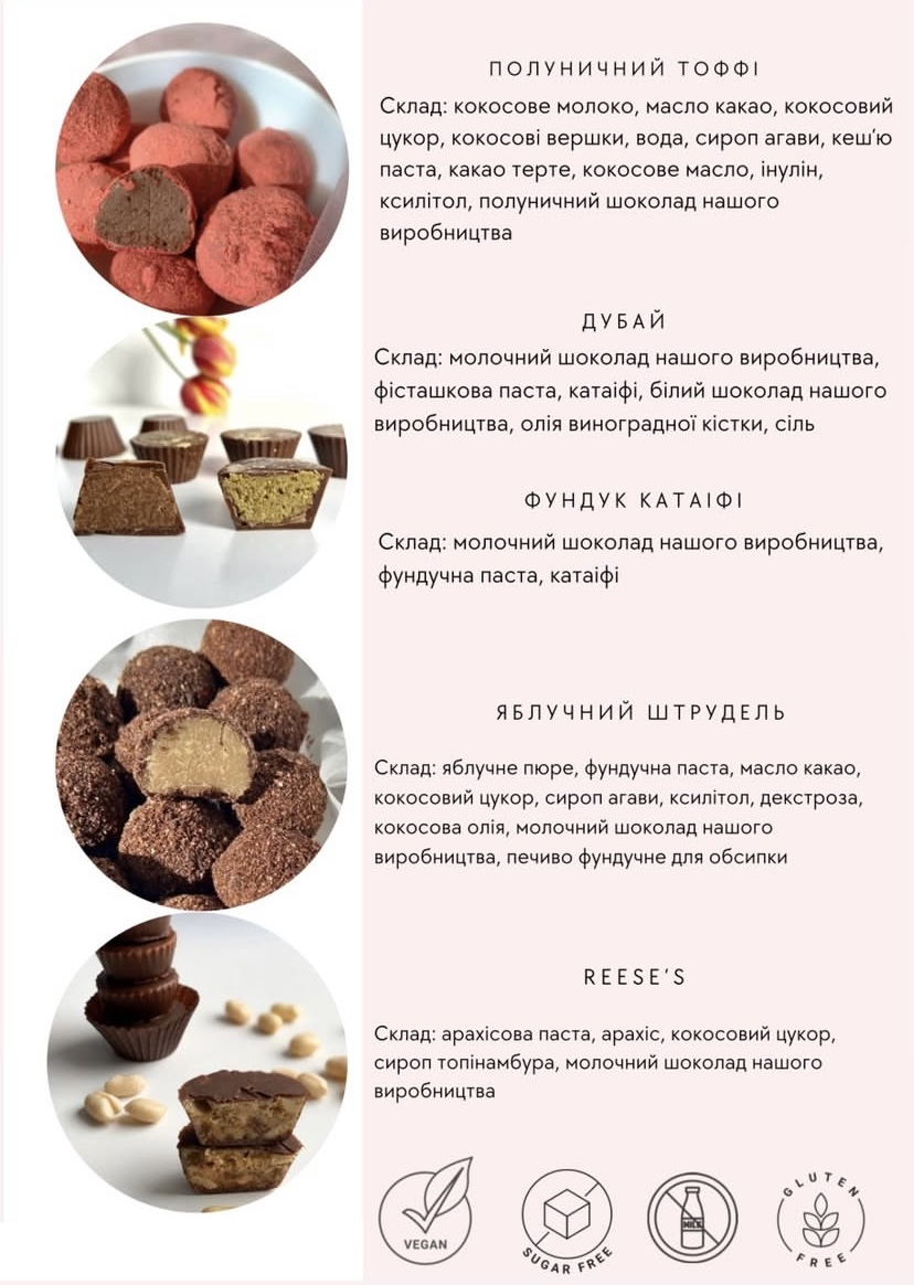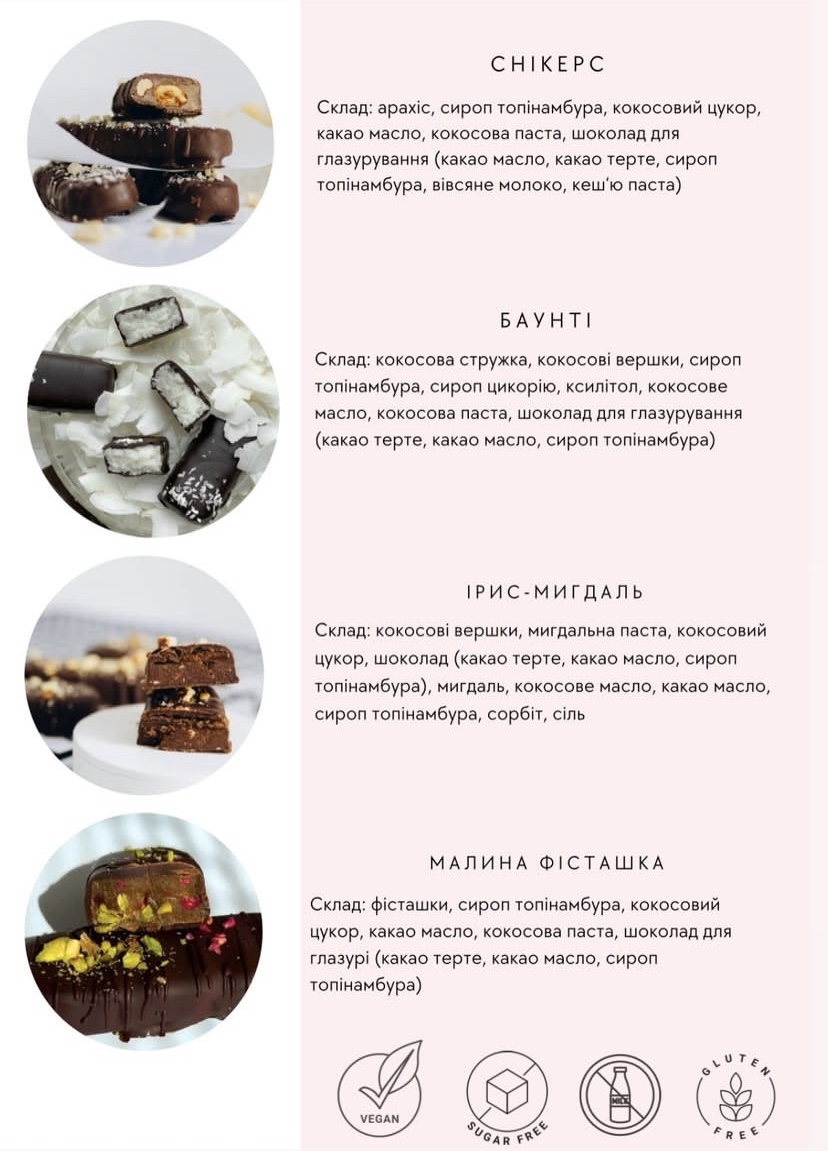 «У клієнтів, які вперше знайомляться з продукцією часто виникає питання: якщо в складі так багато інгредієнтів немає — то що ж залишається? Лактозу ми замінюємо на мигдальне, вівсяне, кокосове молоко та вершки. Також використовуємо горіхи, тофу. Замість глютенового борошна — рисове, мигдальне, кукурудзяне, нутове, вівсяне.