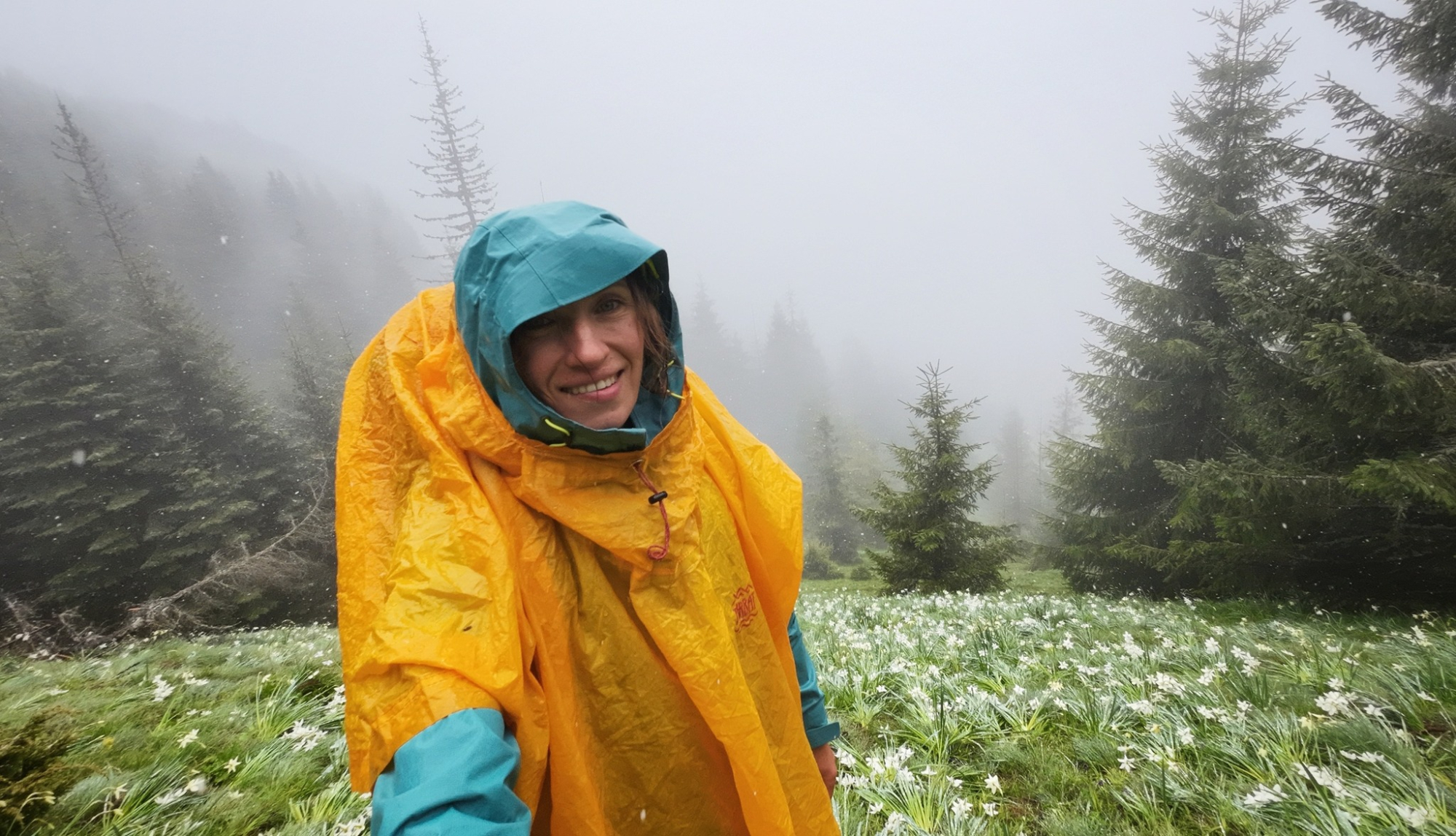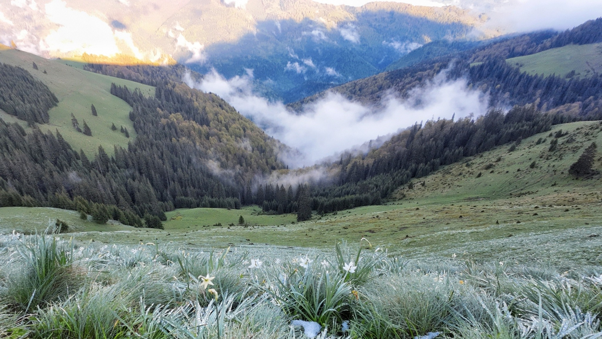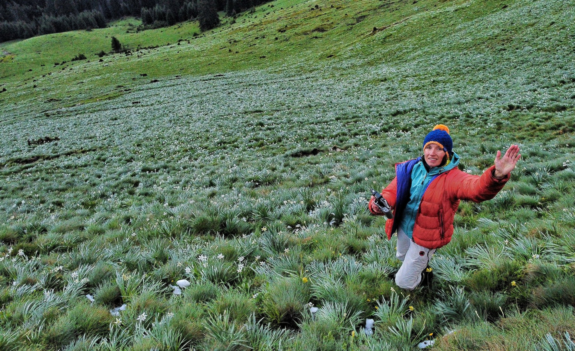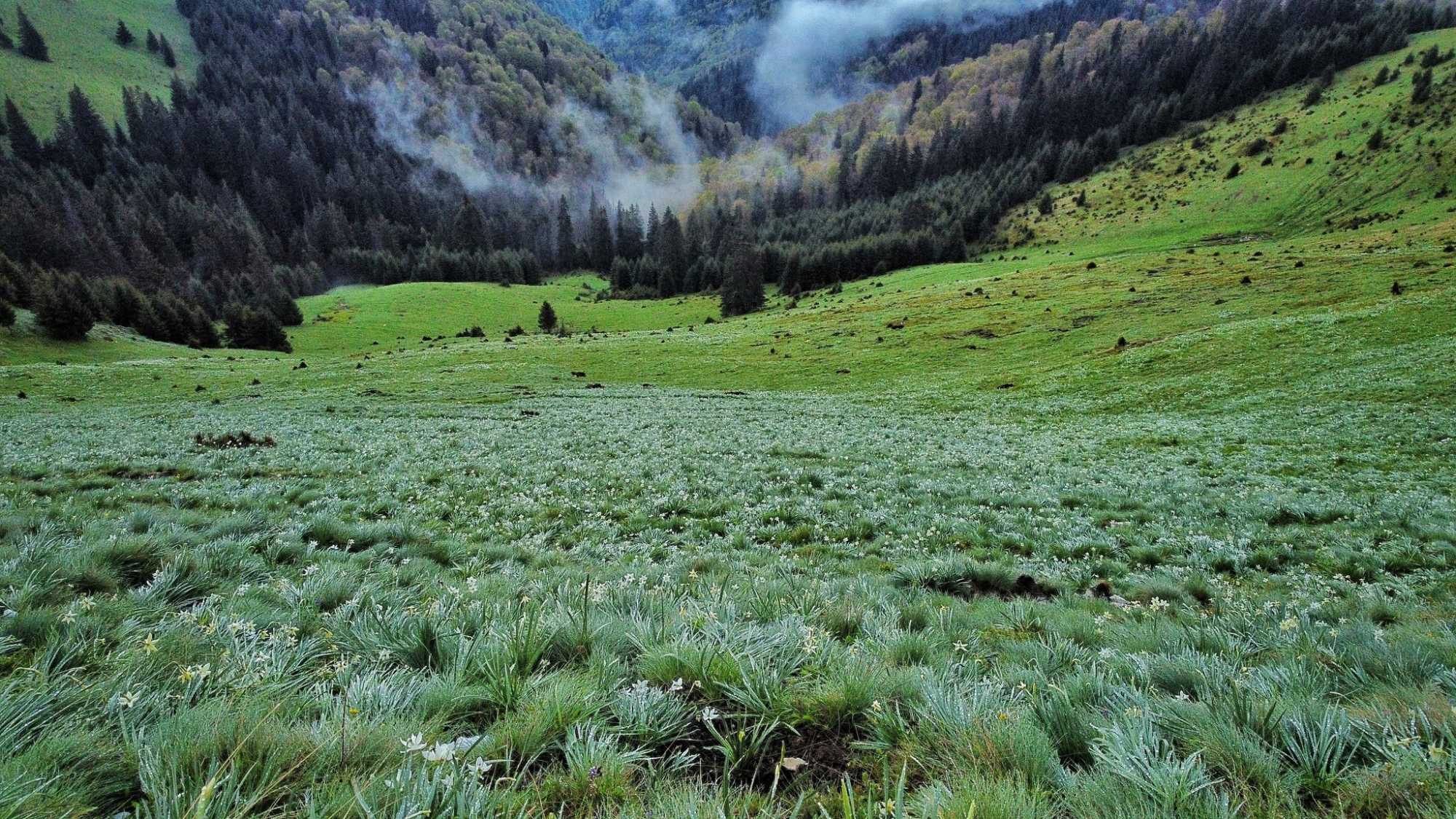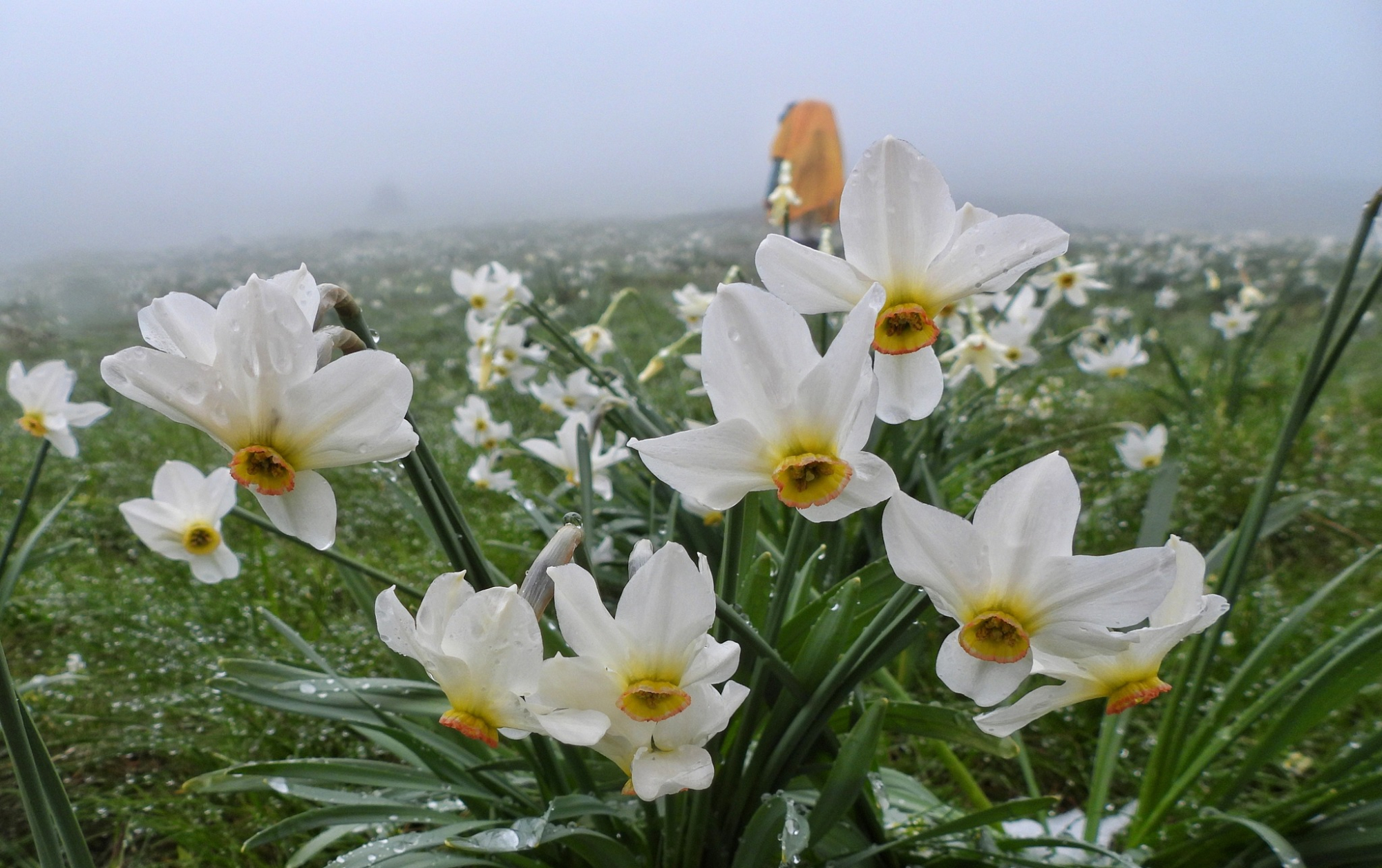 "Найбільша долина диких нарцисів в Карпатах. Через холодну погоду квіти ще не квітнуть надто масово. Ми потрапили туди коли сніг падав на заквітчані схили. Але нарциси все одно квітнуть посеред снігу", - підписала фото Любов Бойко.
