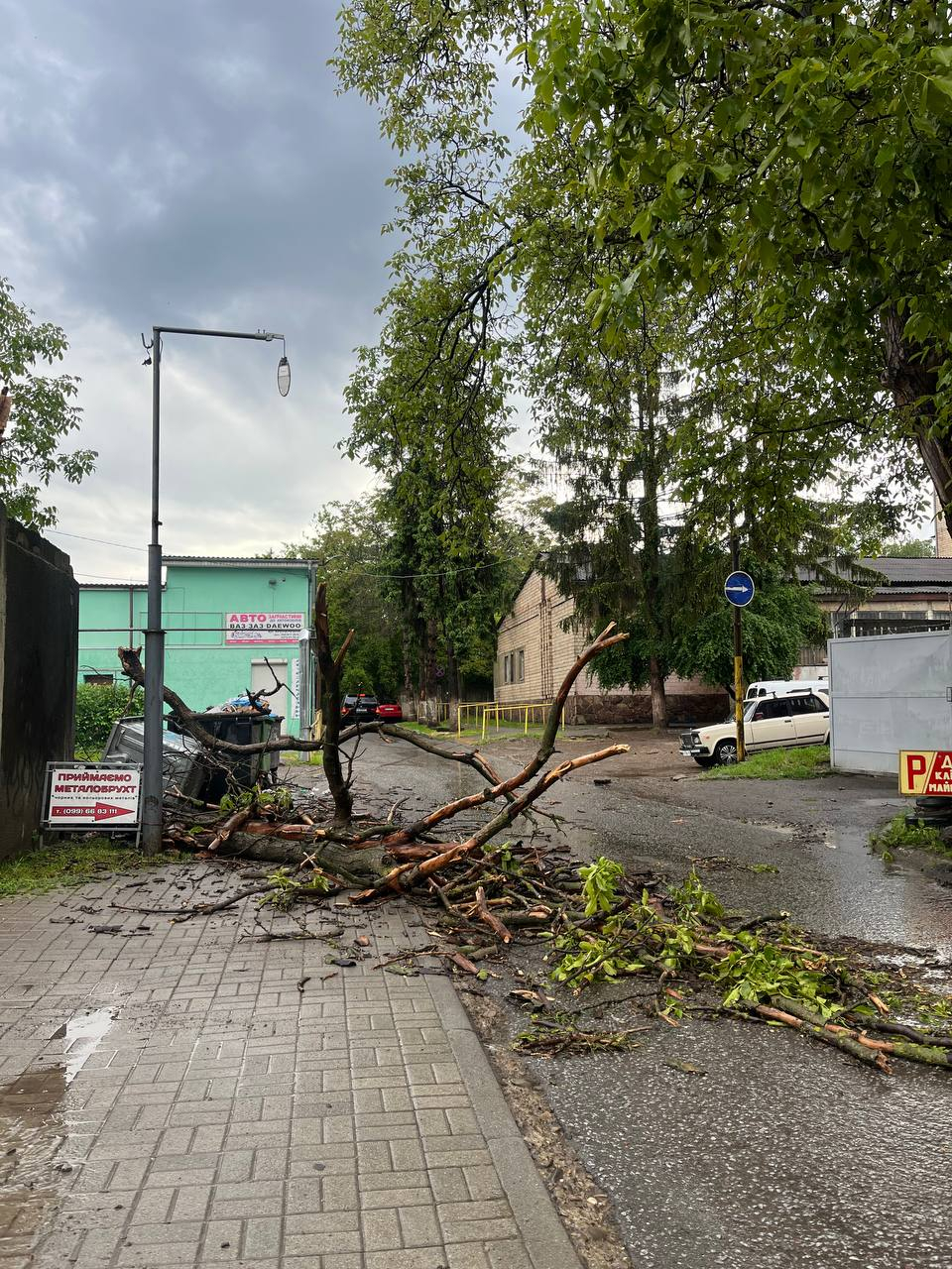 Біля входу на ринок "Карпати" поблизу будинку на Головній, 196 через зливу впало дерево і перекинувся контейнер зі сміттям.