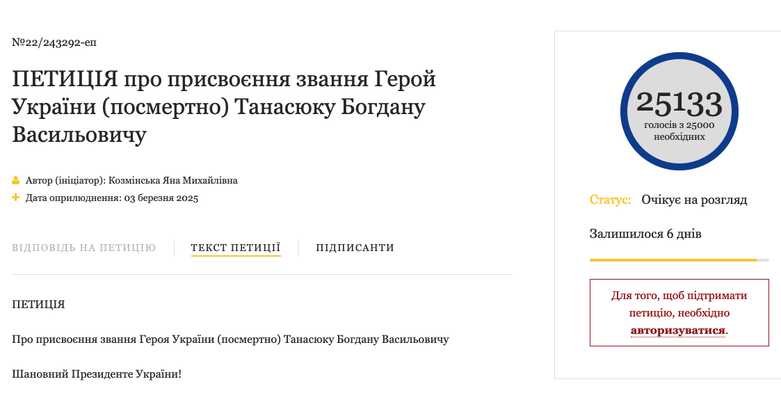 Прошу всіх небайдужих підтримати цю петицію та вшанувати героя, який поклав життя за наше майбутнє.