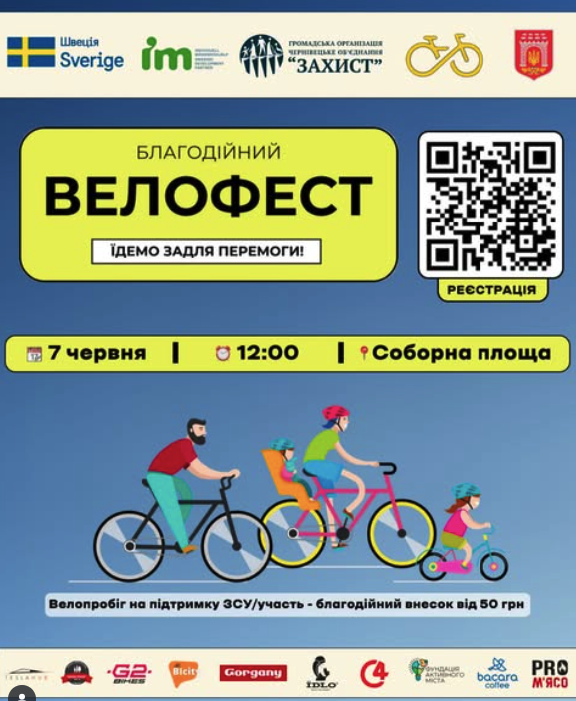 7 червня у Чернівцях стартує «Велофест 2025». Щоб долучитися до події, потрібно зробити благодійний внесок. Уже 35 охочих зареєструвалися. Усі зібрані кошти передадуть на підтримку ЗСУ.