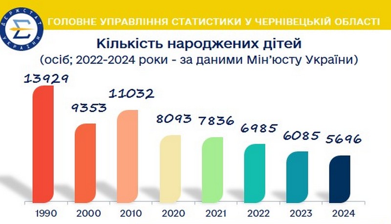 Як повідомили в Головному управлінні статистику у Чернівецькій області, торік на Буковині народилося 5696 малюків. Усі попередні роки ці показники були вищими. Зокрема у 2020 році В Чернівецькій області народилося 8093 дітей, в 2021 – 7836, в 2022 – 6985, а в 2023 – 6085.