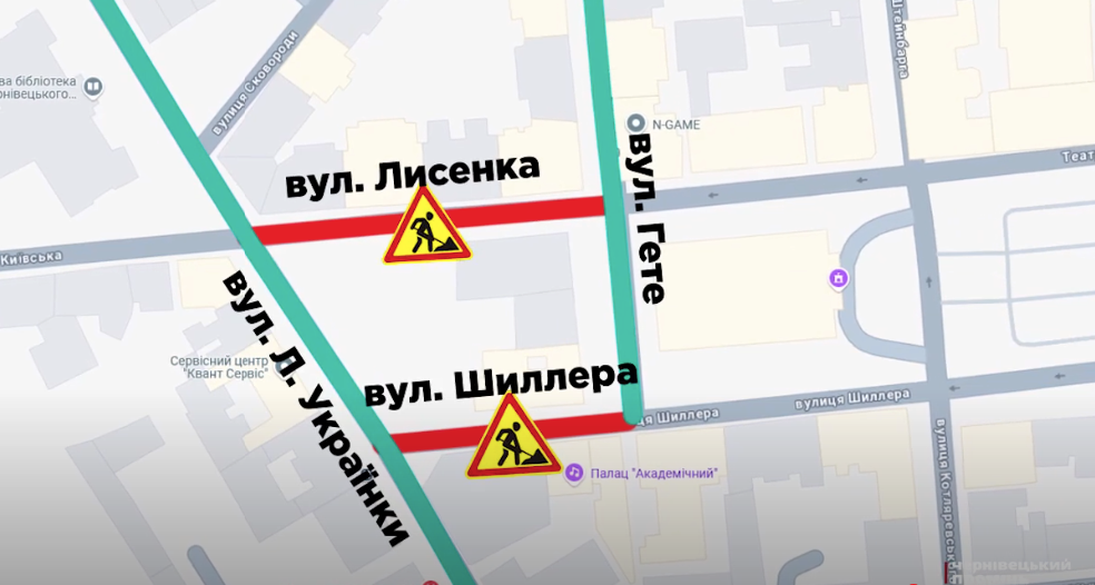 - Лисенка (від вул. Л. Українки до вул. Гете) та Шиллера (від вул. Л. Українки до вул. Гете).