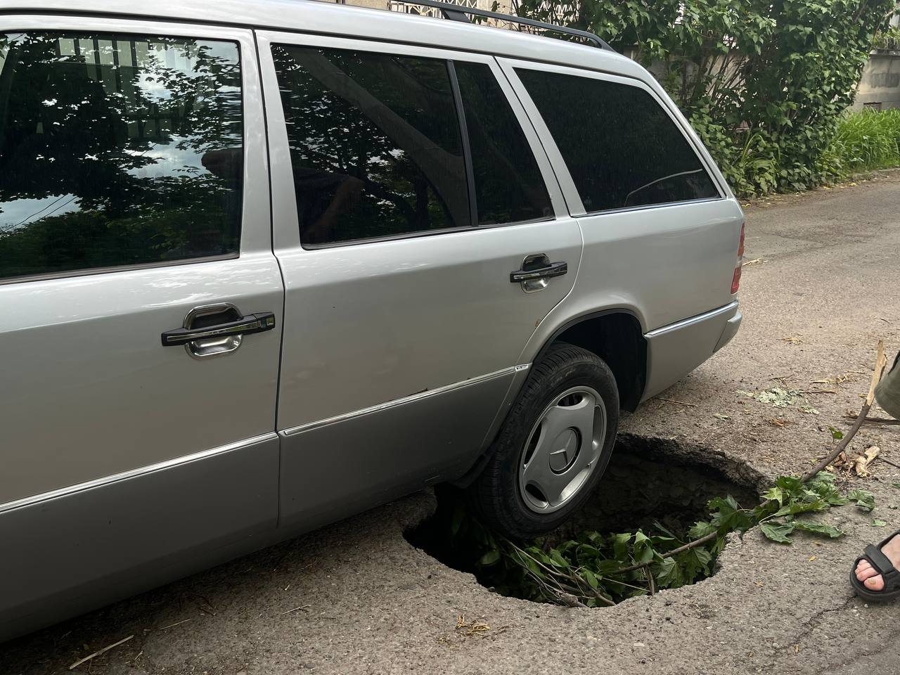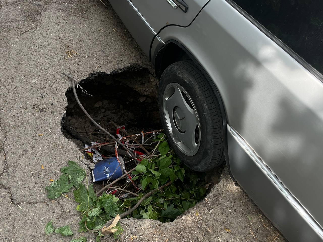 У Чернівцях посеред дороги по вулиці Гребінки провалився асфальт. Утворилася яма завширшки близько метра і такої ж глибини. Водій не встиг зреагувати й втрапив у провалля.