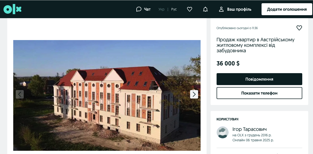 На платформі OLX вже з’явилися оголошення про продаж квартир у "Австрійському житловому комплексі". Вартість однієї квартири стартує від 36 тисяч доларів США.