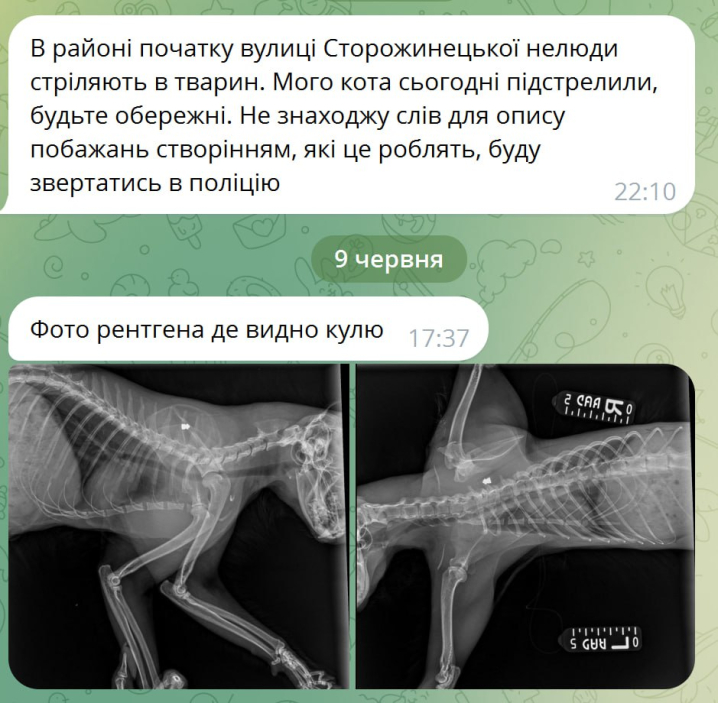 «На початку вулиці Сторожинецької нелюди стріляють в тварин. Мого кота підстрелили», - йдеться у повідомленні.