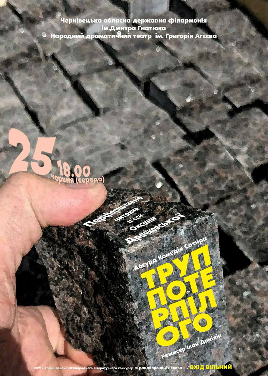 25 червня о 18:00 у Чернівецькій обласній філармонії імені Дмитра Гнатюка відбудеться перформативне читання п’єси Оксани Драчковської «Труп потерпілого».