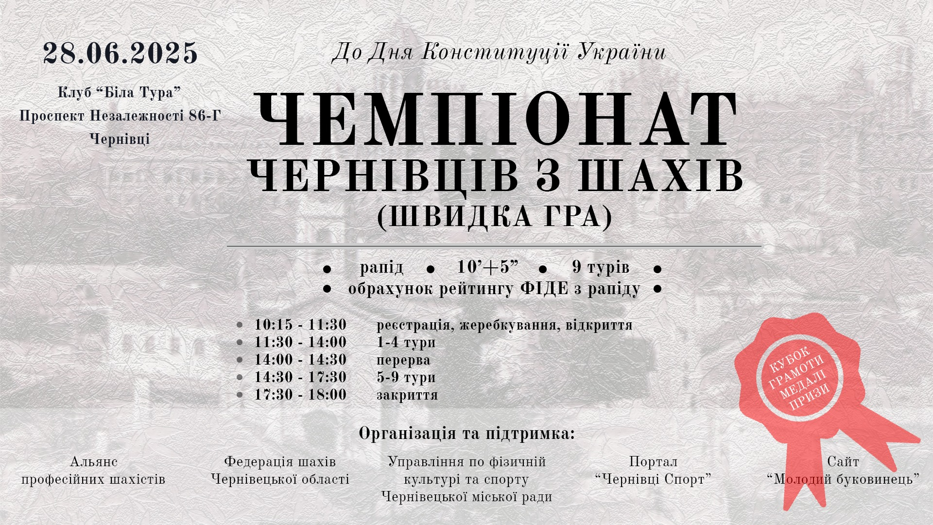 У суботу, 28 червня, у шаховому клубі «Біла тура» відбудеться Чемпіонат міста Чернівці з рапіду (з нагоди Дня Конституції України).