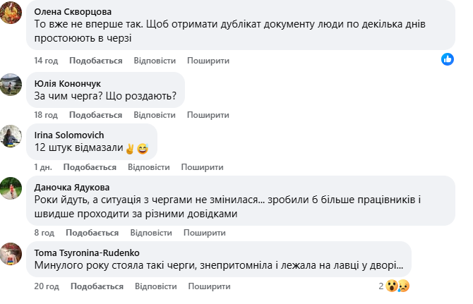 "Три дні стояла в черзі в Рагсі на Кобилянській, це просто жах, відношення як до скота, купа людей і один стілець. На гарячу лінію дозвонитись взагалі нереально! Дякую автору поста,що висвітлив цю проблему, але дуже сумніваюсь, що щось зміниться, РАЦС залишився в минулому, вони ще в СССР((", - пише Анжела Мартинішина.