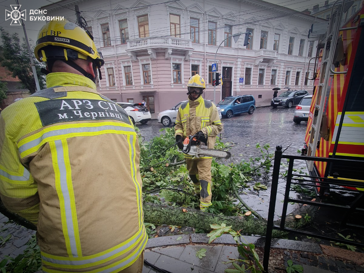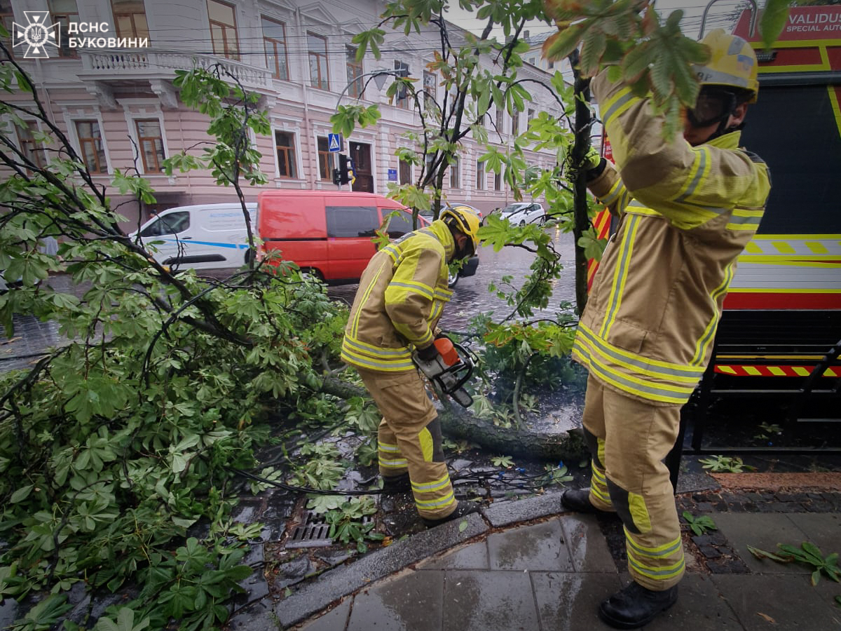 "27 червня до Служби порятунку надійшло повідомлення від правоохоронців про те, що в місті Чернівці на розі вулиць Кафедральної та Головної дерево впало на проїжджу частину та частково перекрито рух транспорту.