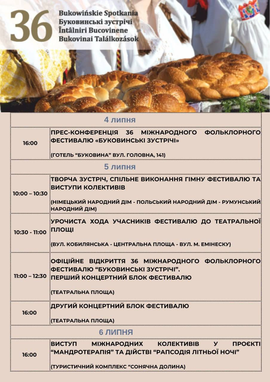 З 4 по 6 липня 2025 року в Чернівцях відбудеться 36-й Міжнародний фольклорний фестиваль "Буковинські зустрічі" – один із найстаріших транскордонних культурних проєктів. Фестиваль об’єднує творчі колективи з України, Румунії, Польщі та Угорщини, презентуючи багатогранну культурну спадщину Буковини.
