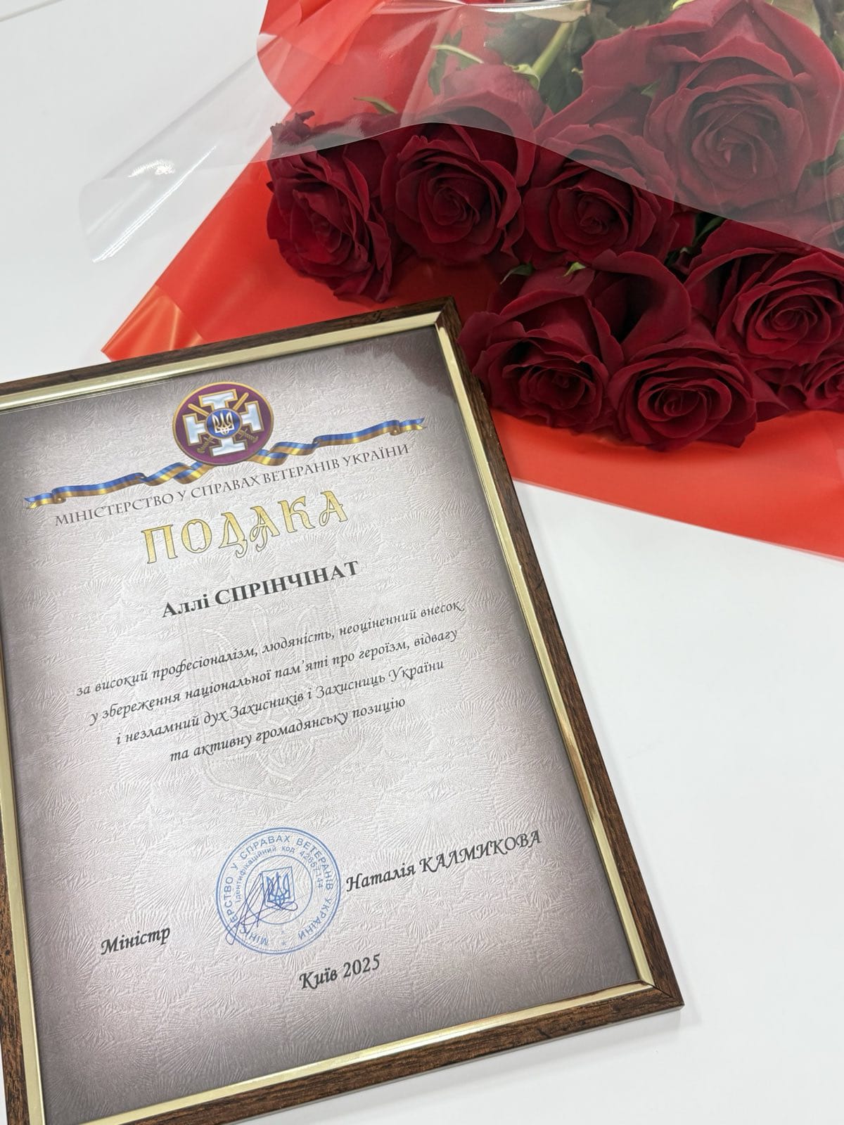 Чернівецька журналістка Аллу Спрінчінат отримала Подяку від Міністерства у справах ветеранів України за волонтерський медійний проєкт «Інтерв’ю з Аллою Спрінчінат». Про це повідомляє Управління з питань ветеранської політики Чернівецької ОДА.