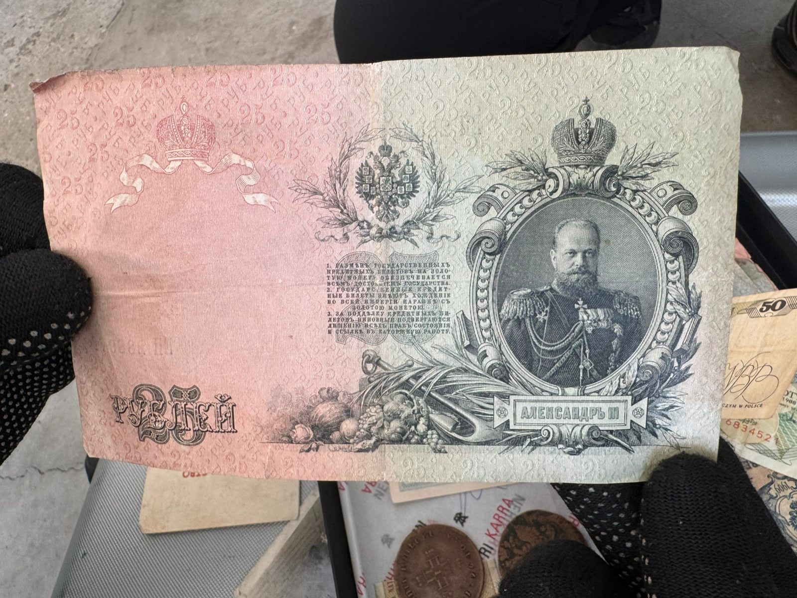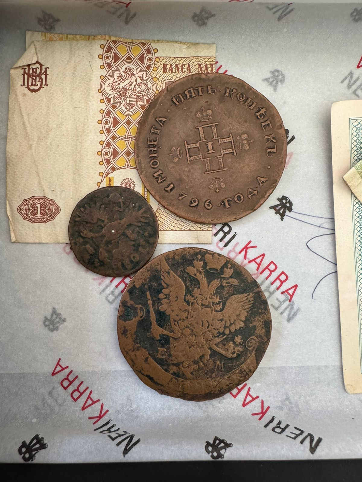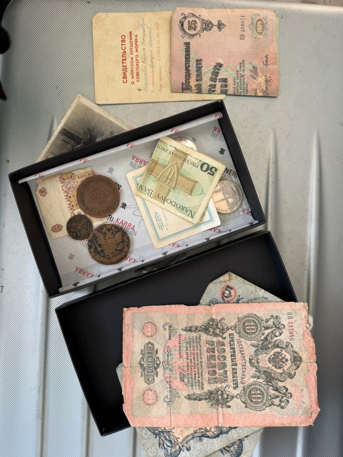 Під час огляду автомобіля прикордонники спільно з представниками митниці в багажному відділенні виявили скриньку, всередині якої знаходилися купюри та монети різного номіналу часів Російської імперії. Всього 6 одиниць, які можливо становлять історичну цінність.