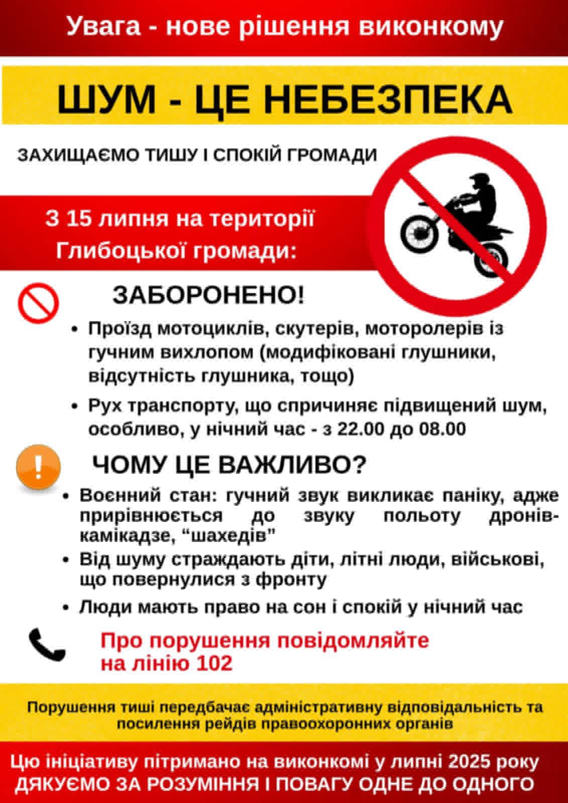 У зв’язку з воєнним станом та необхідністю збереження спокою мешканців, виконавчий комітет Глибоцької селищної ради ухвалив рішення обмежити рух мотоциклів, скутерів і моторолерів із підвищеним рівнем шуму. Про це повідомляє на фейсбук-сторінці Глибоцька територіальна громада.