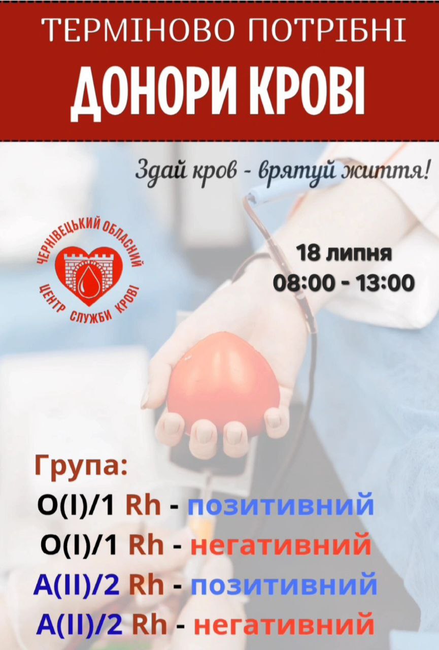 Чернівецький обласний центр служби крові повідомляє про термінову потребу у 1 і 2 групі крові позитивного та негативного резус-факторів.