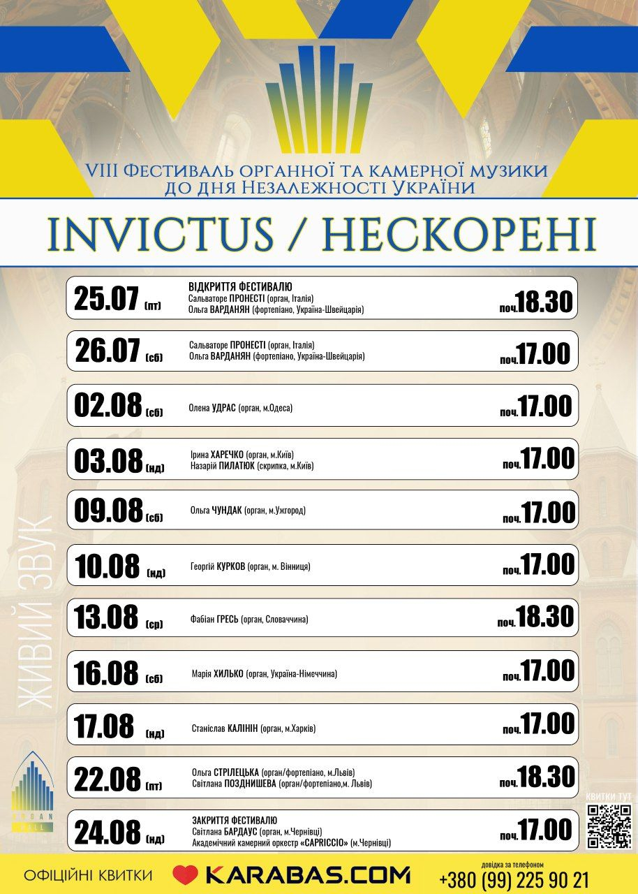 "Упродовж одинадцяти фестивальних днів презентуватимуть своє мистецтво музиканти-віртуози з Італії, Швейцарії, Словаччини, Німеччини. Україну представлятимуть митці з Києва, Харкова, Одеси, Вінниці, Львова, Ужгорода, Чернівців, щедро даруючи цілющі краплини життєдайності з джерел музичних, щирість почуттів, незгасиму віру у переможне торжество світла, любові і добра!. Разом - ми сила! І це підтверджує наш фестиваль - "INVIСTUS/НЕСКОРЕНІ”, який утверджує торжество духу нескореного, торжество життя - "...Бо волю й правду не здолати - допоки музика звучить”!, - кажуть організатори.