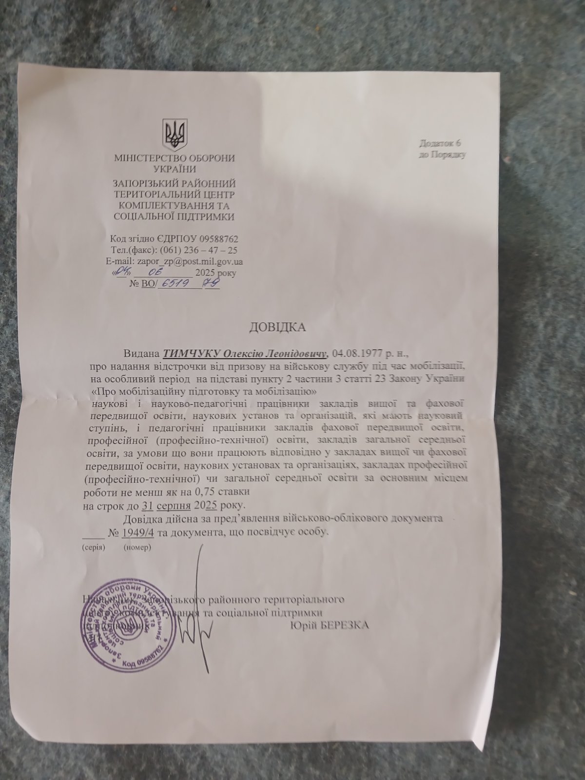 В Ужгороді мобілізували кандидата юридичних наук, доцента кафедри Кримінального, цивільного та міжнародного права юридичного факультету Національного університету "Запорізька політехніка" Олексія Тимчука, який мав відстрочку. Про це повідомив професор кафедри Юрій Філей.