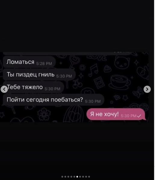 Він залізає до неї у вікно, дзвонить з усіх номерів які тільки може дістати, дістається до її бабусі та поширює не правдиву інформацію ТІЛЬКИ тому що вона втекла від нього через всі вищезгадані причини. Наразі відомо що вона не перша і не остання жертва. Дублюю у фото пост з інстаграму", - написали у дописі.