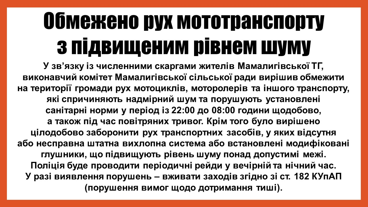 У Мамалигівській ТГ виконком сільської ради ухвалив рішення обмежити рух мотоциклів, мопедів та іншого транспорту, що спричиняє надмірний шум.