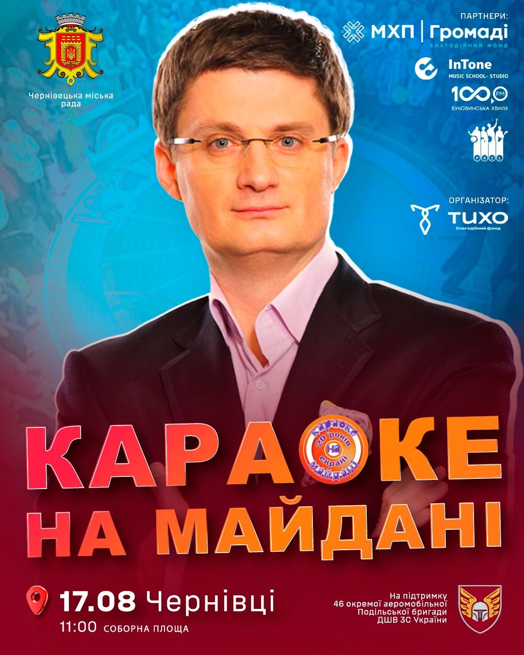 17 серпня на Соборній площі у Чернівцях відбудеться легендарне шоу «Караоке на майдані». Глядачі зможуть заспівати улюблені пісні, проголосувати за переможців та долучитися до збору коштів на підтримку 46-ї аеромобільної Подільської бригади ДШВ ЗСУ.