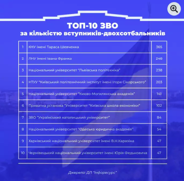 Оприлюднено статистику, у які виші вступило найбільше 200-бальників. Найбільше успішних вступників у Київському національному університетут імені Т. Шевченка. Також у лідерах Львівській національний універистет та національний університет "Львівська політехніка".