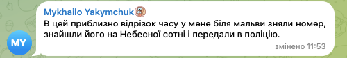 «Цей приблизно відрізок часу у мене біля "Мальви” зняли номер. Знайшли його на Небесної Сотні та передали в поліцію», - написав Михайло Якимчук.