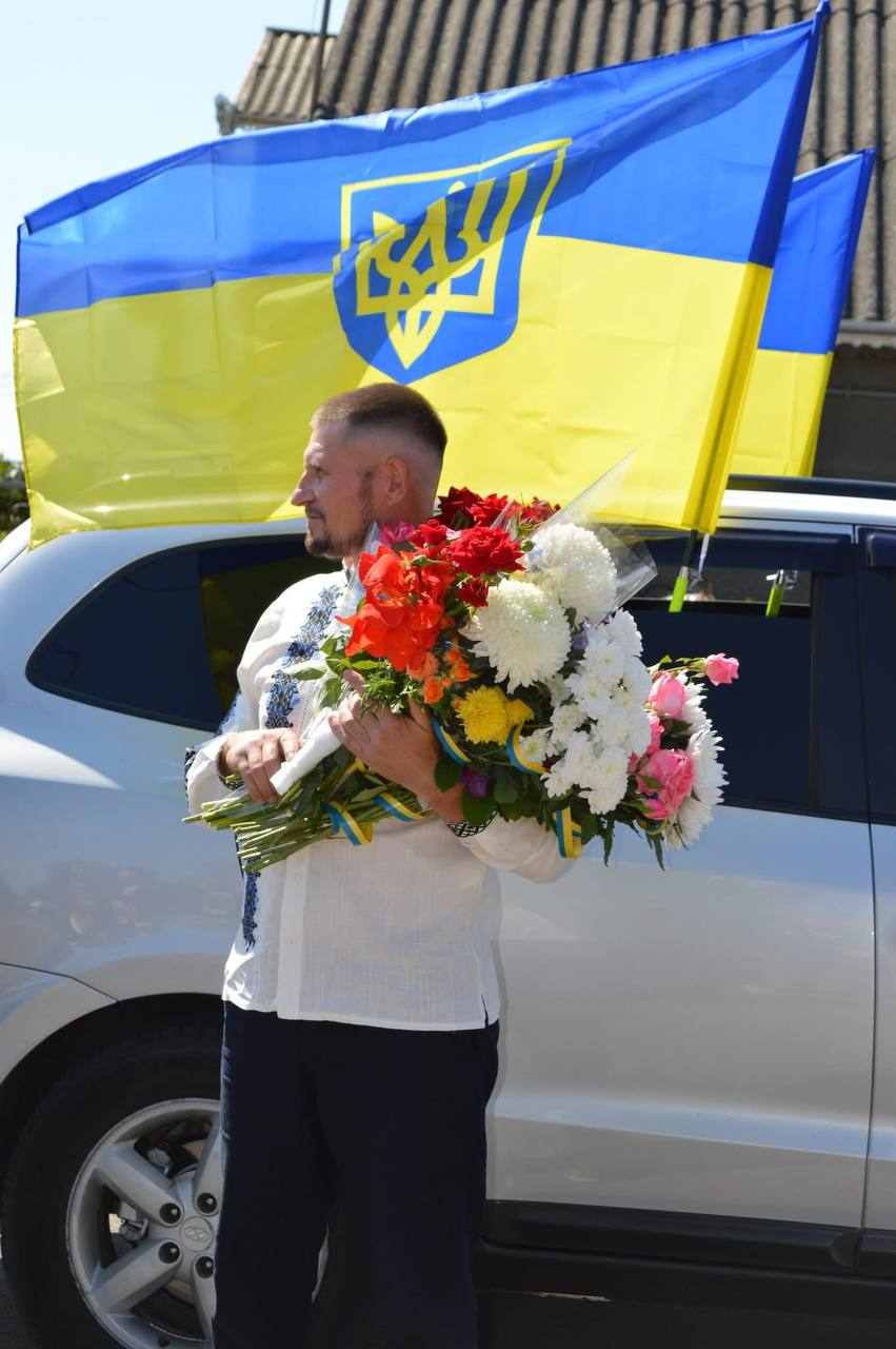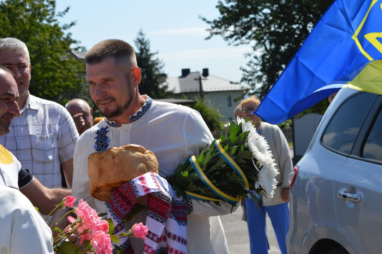 Героя вітали синьо-жовтими прапорами та короваєм.