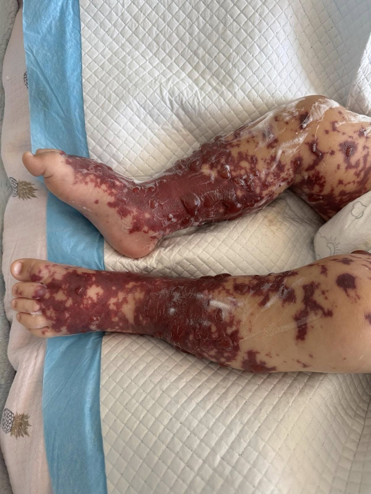 - на шкірі швидко з’являються висипання, що зливаються та переходять у некрози;