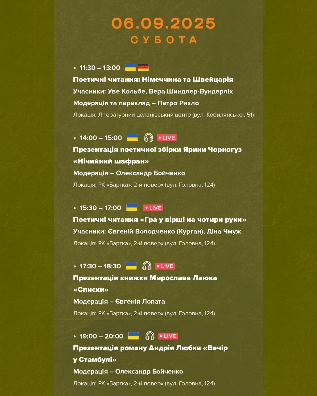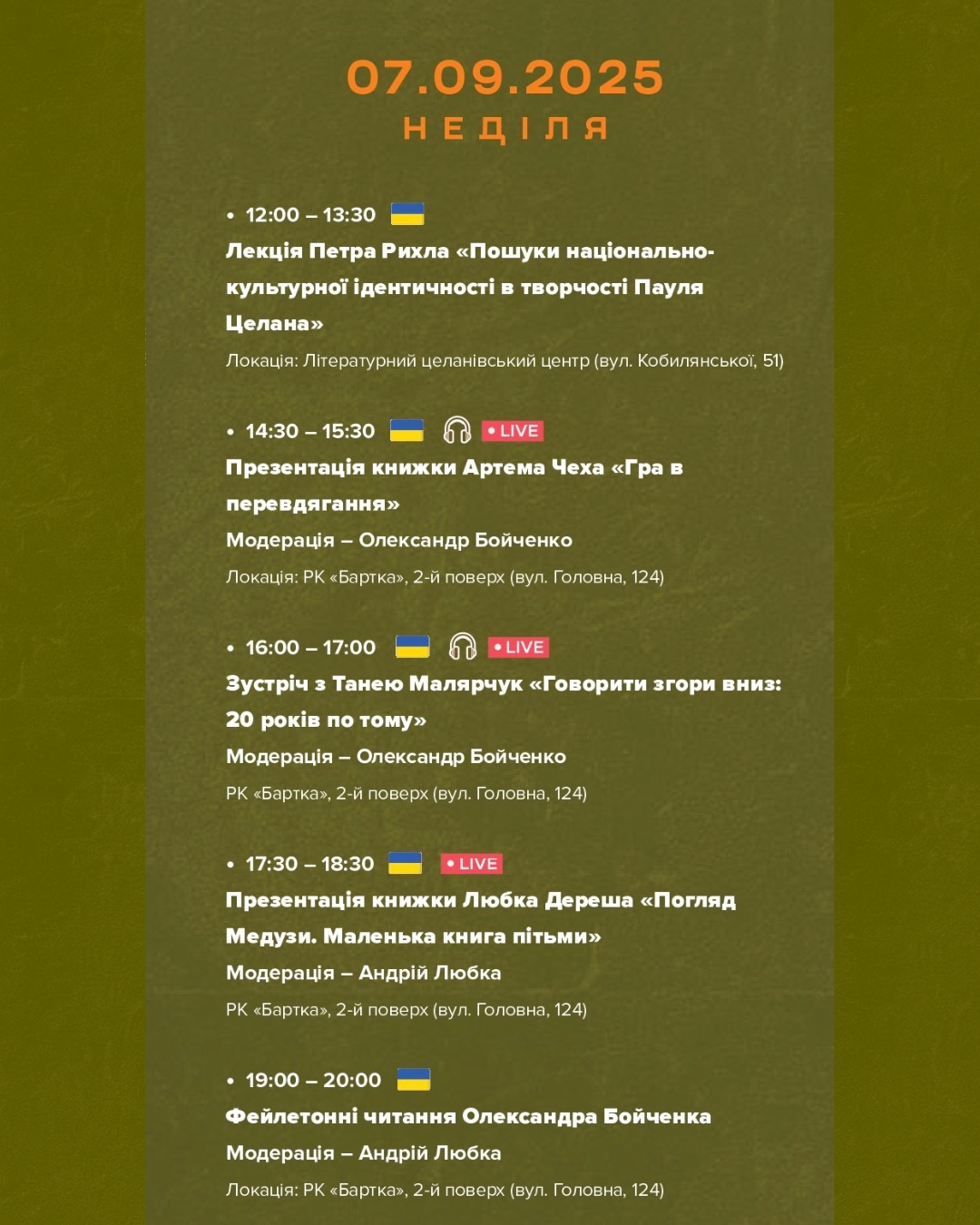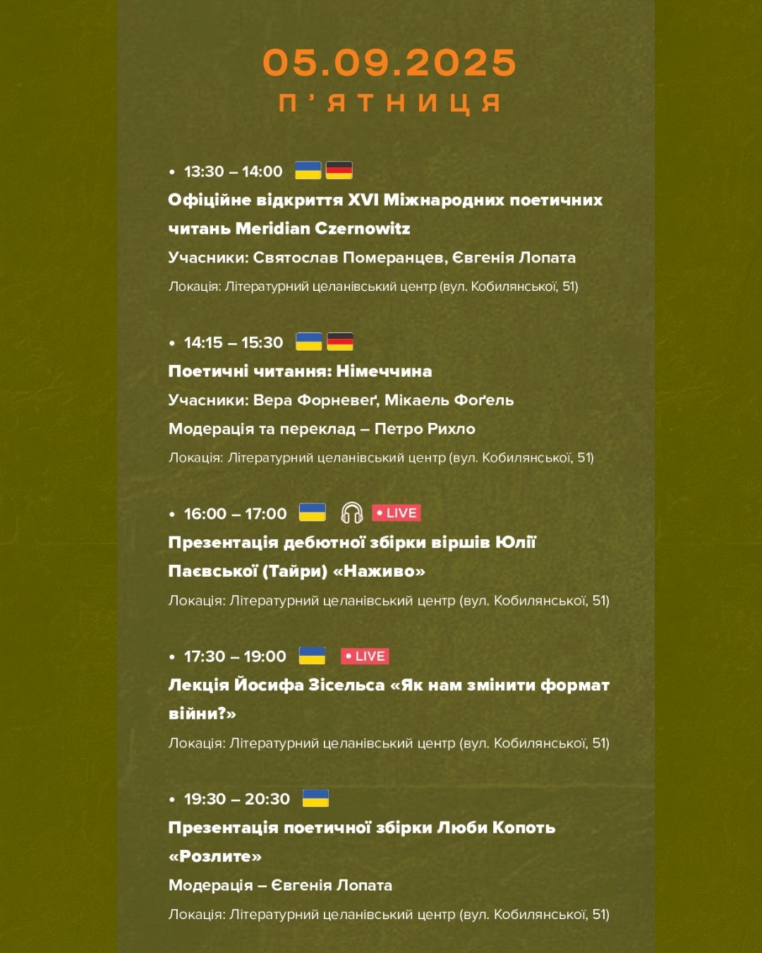 Вхід на всі події безкоштовний. Також на фейсбук сторінці Meridian Czernowitz буде вестись онлайн трансляція майже усіх заходів.