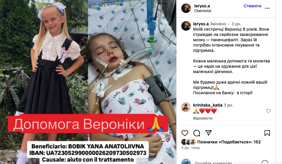 Рідні звертаються про матеріальну допомогу, продовжуючи боротися за життя 8-річної Вероніки