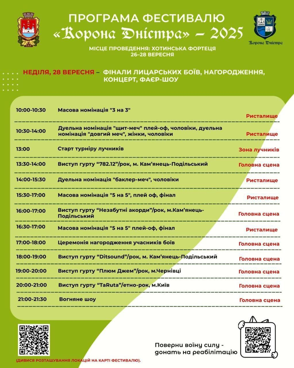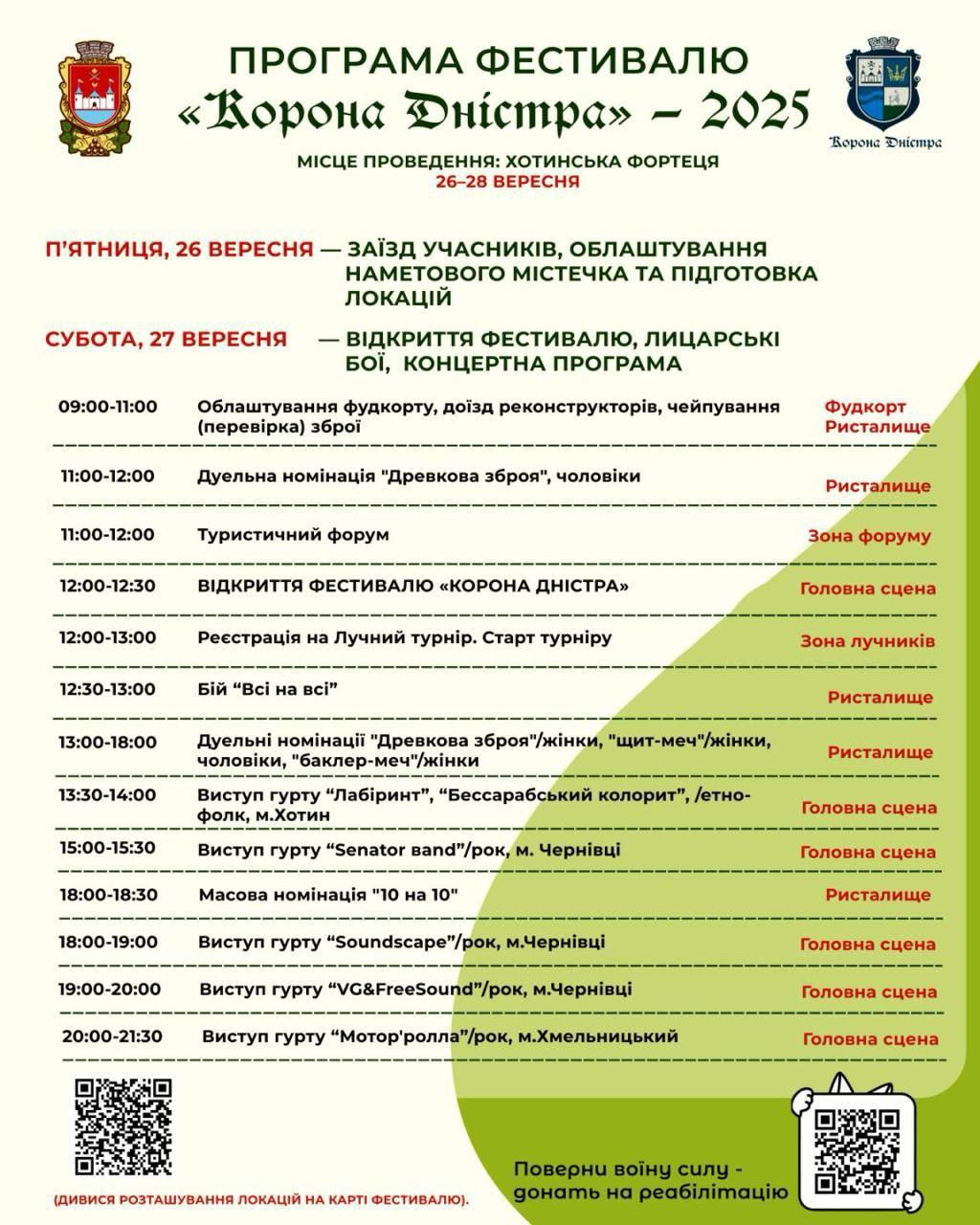 У Хотині відбудеться масштабний фестиваль "Корона Дністра". Вхід на фестиваль – за довільний донат. Вартість квитка на територію фортеці – стандартна. Для військових та учасників бойових дій вхід безкоштовний.