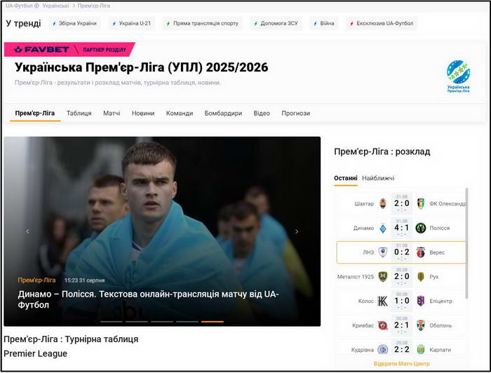 Сайт висвітлює футбольні змагання самого різного рівня: від аматорських ліг до найпрестижніших міжнародних турнірів. Але головним своїм пріоритетом тут вважають популяризацію українського чемпіонату. Для кожного матчу УПЛ організується пряма текстова трансляція, якій передує детальний анонс з прогнозами відомих експертів. По завершенні гри на її сторінці з'являється огляд, відео найкращих моментів, коментарі учасників.