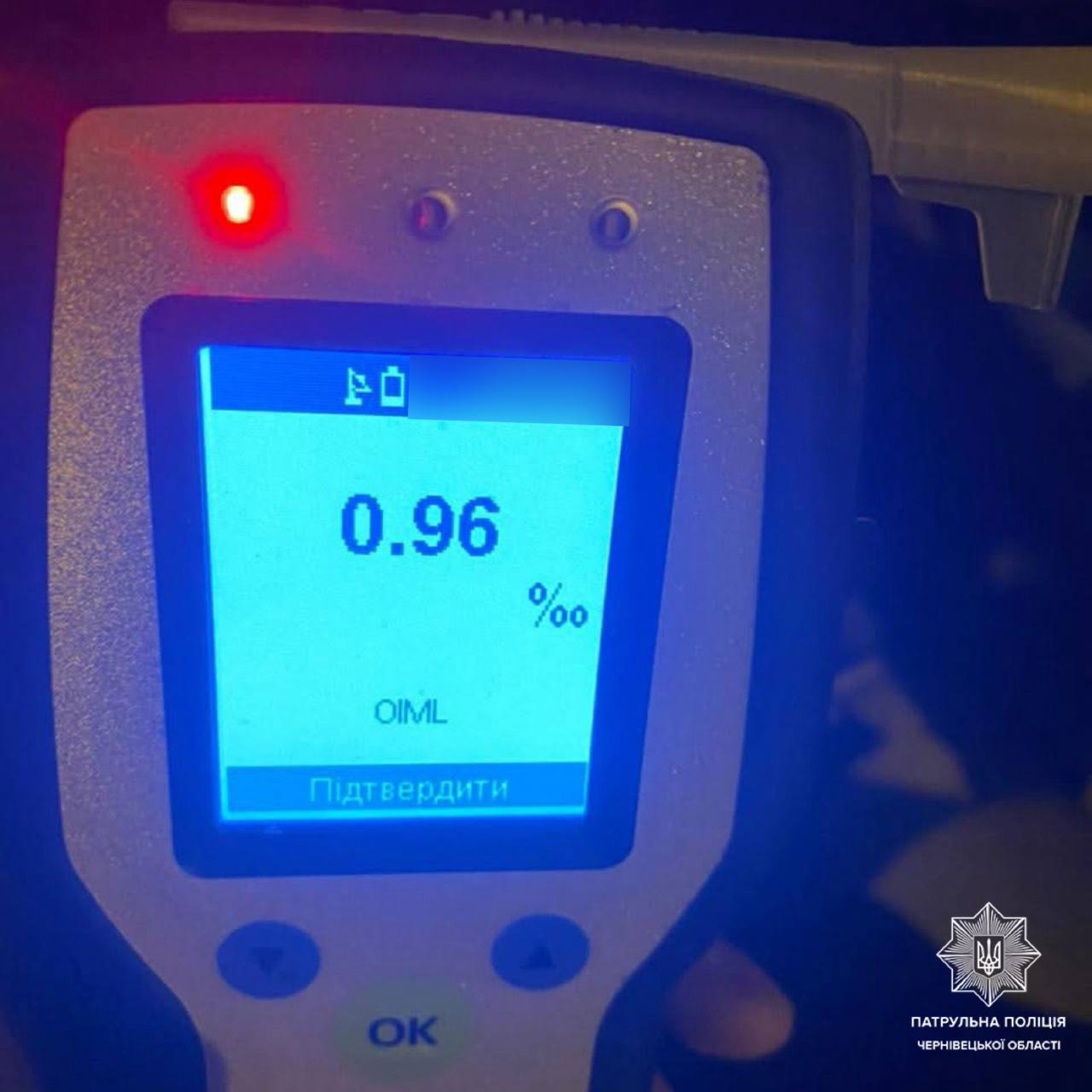 Під час спілкування поліцeйські помітили, що у керманича присутні характерні ознаки алкогольного сп'яніння. Громадянин погодився пройти огляд на стан сп'яніння на місці зупинки, за допомогою газоаналізатора Драгер. Результат позитивний — 0,96 проміле", - йдеться у повідомленні.