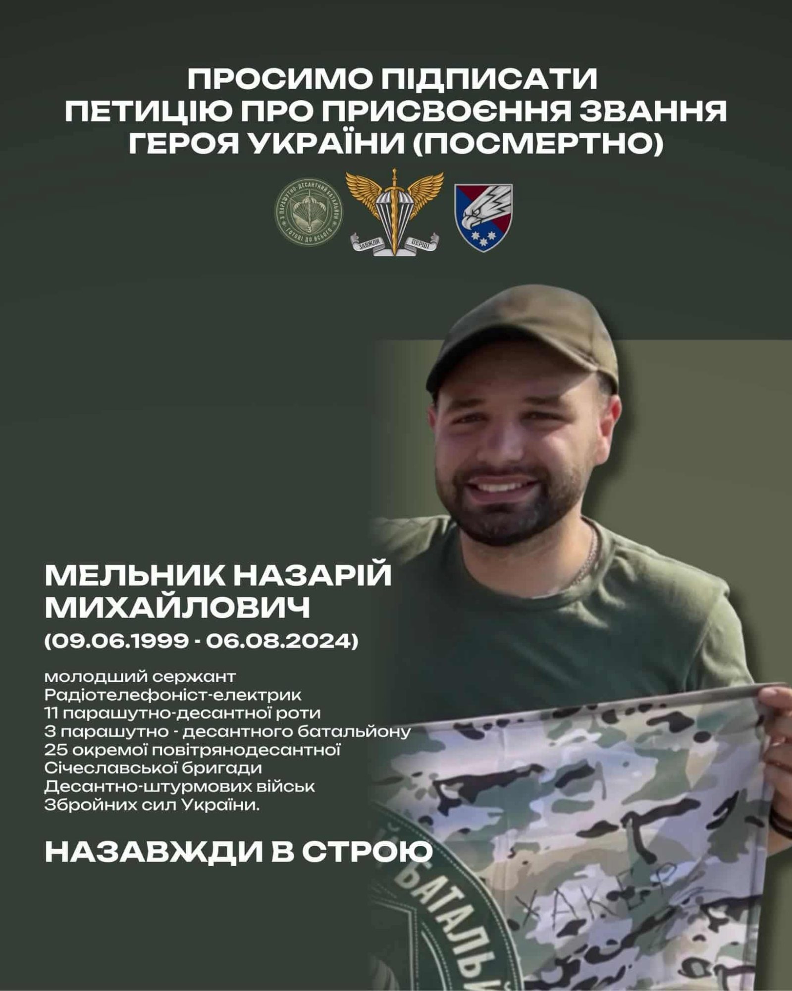 [quote]"Звертаємося до Вас з проханням присвоїти високе звання Героя України (посмертно) Мельнику Назарію Михайловичу - молодшому сержанту 25 окремої повітряно-десантної Січеславської бригади - захиснику України, який віддав найдорожче - життя, у боротьбі за свободу та незалежність України.Текст петиції: