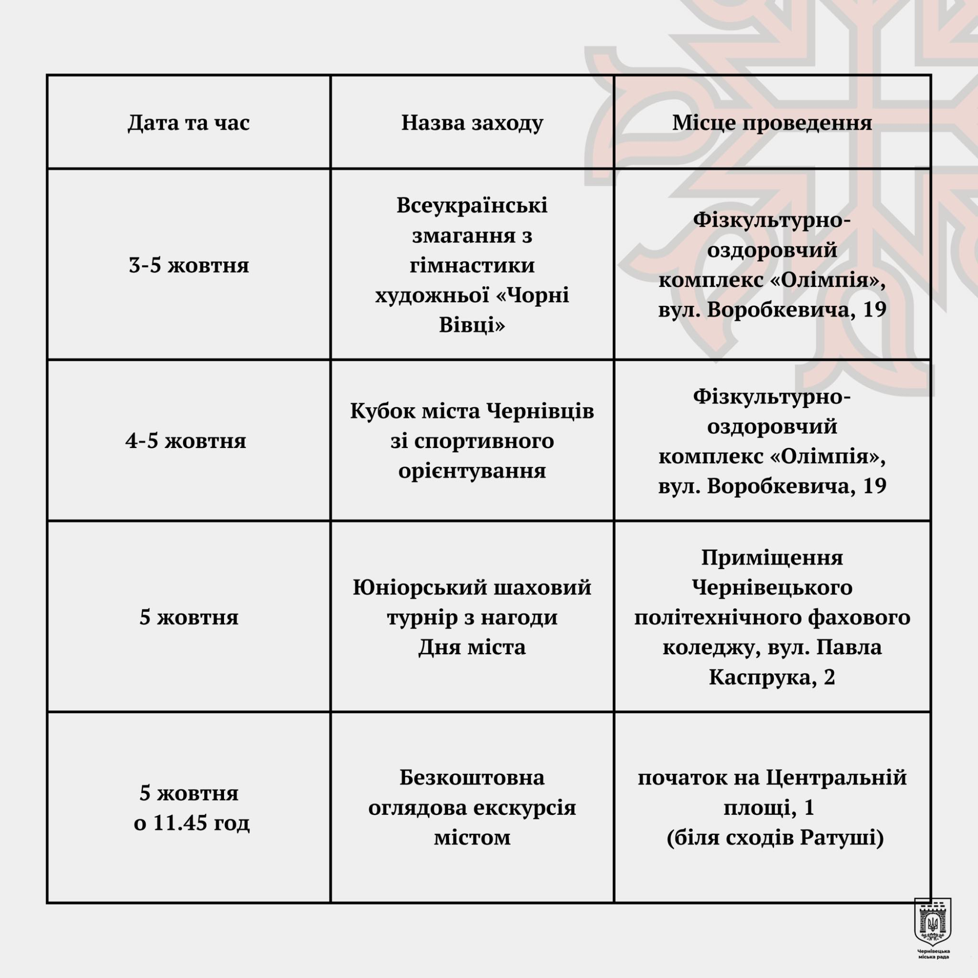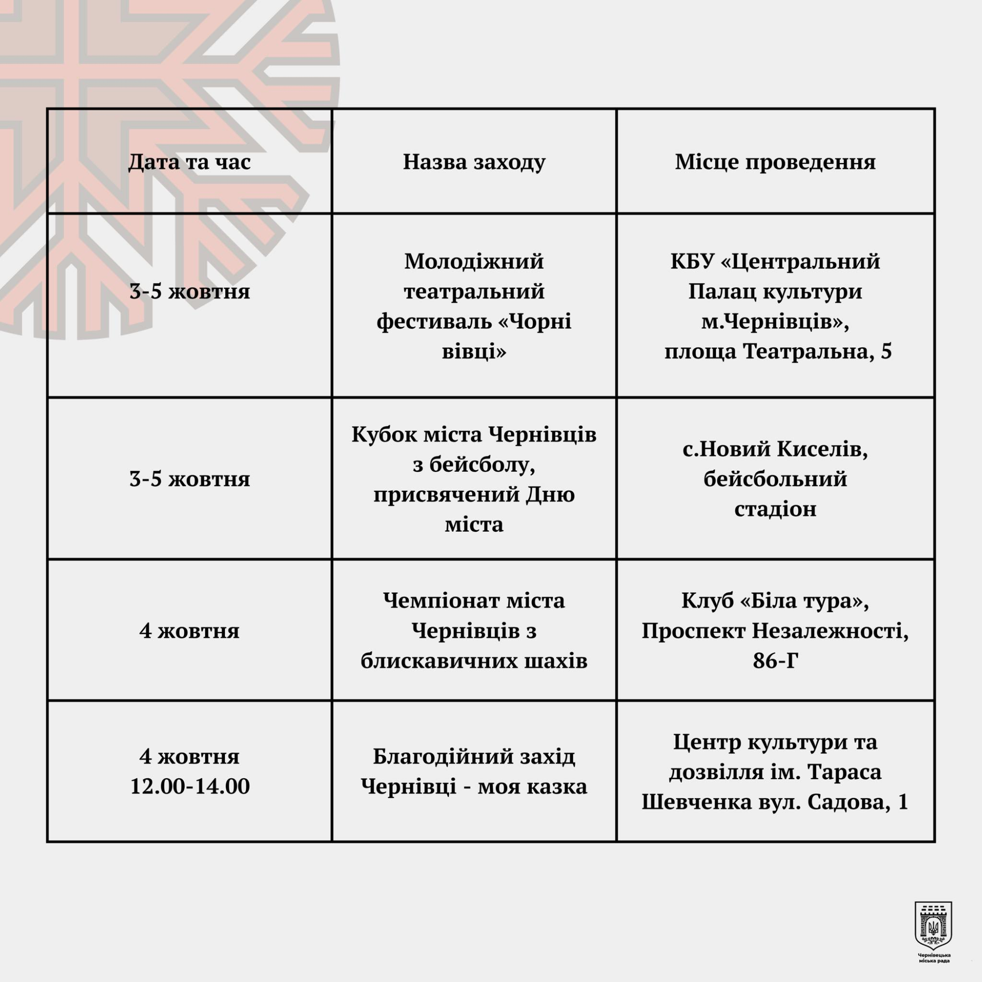 Протягом вихідних, 4 і 5 жовтня, у Чернівцях з нагоди Дня міста запланована низка культурних та спортивних заходів. Про це повідомили у пресслужбі міської ради.