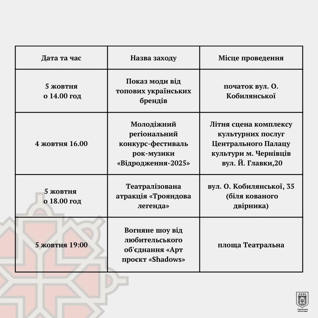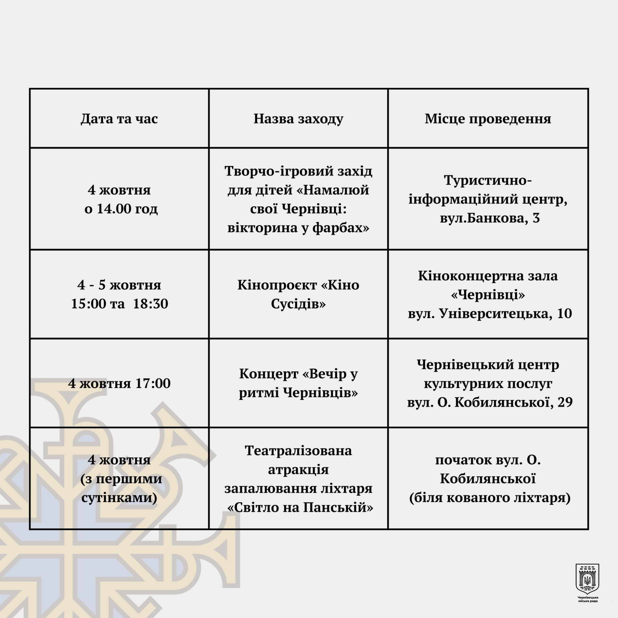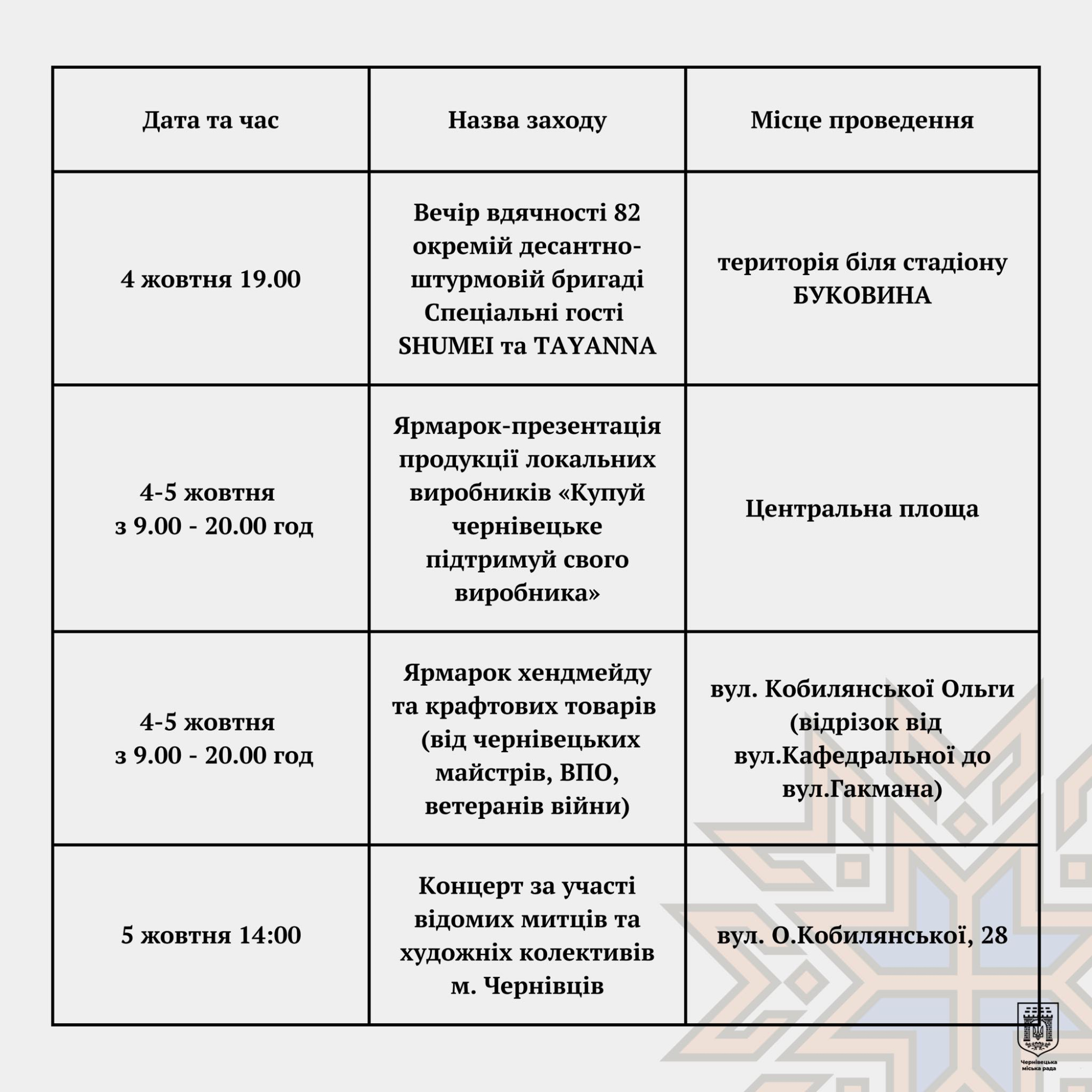 Зокрема, сьогодні, 4 жовтня, відбудеться вечір вдячності 82 окремій десантно-штурмовій бригаді, де виступлять співаки SHUMEI і TAYANA. Також відбудеться ярмарок хендмейду, творчо-ігровий захід для дітей, запалювання ліхтаря на Панській та концерт "Вечір у ритмі Чернівців".
