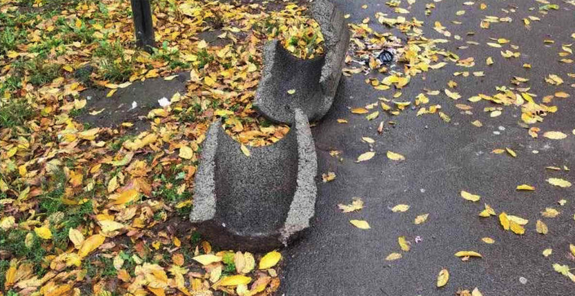 Цементні смітники розбили навпіл, а лавиці перевернули догори дригом та відламали дерев'яні поручні лавиці.