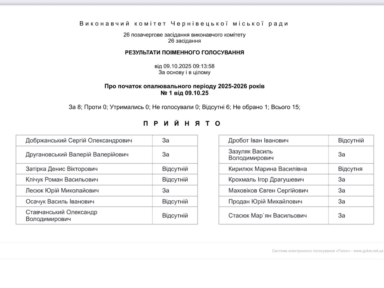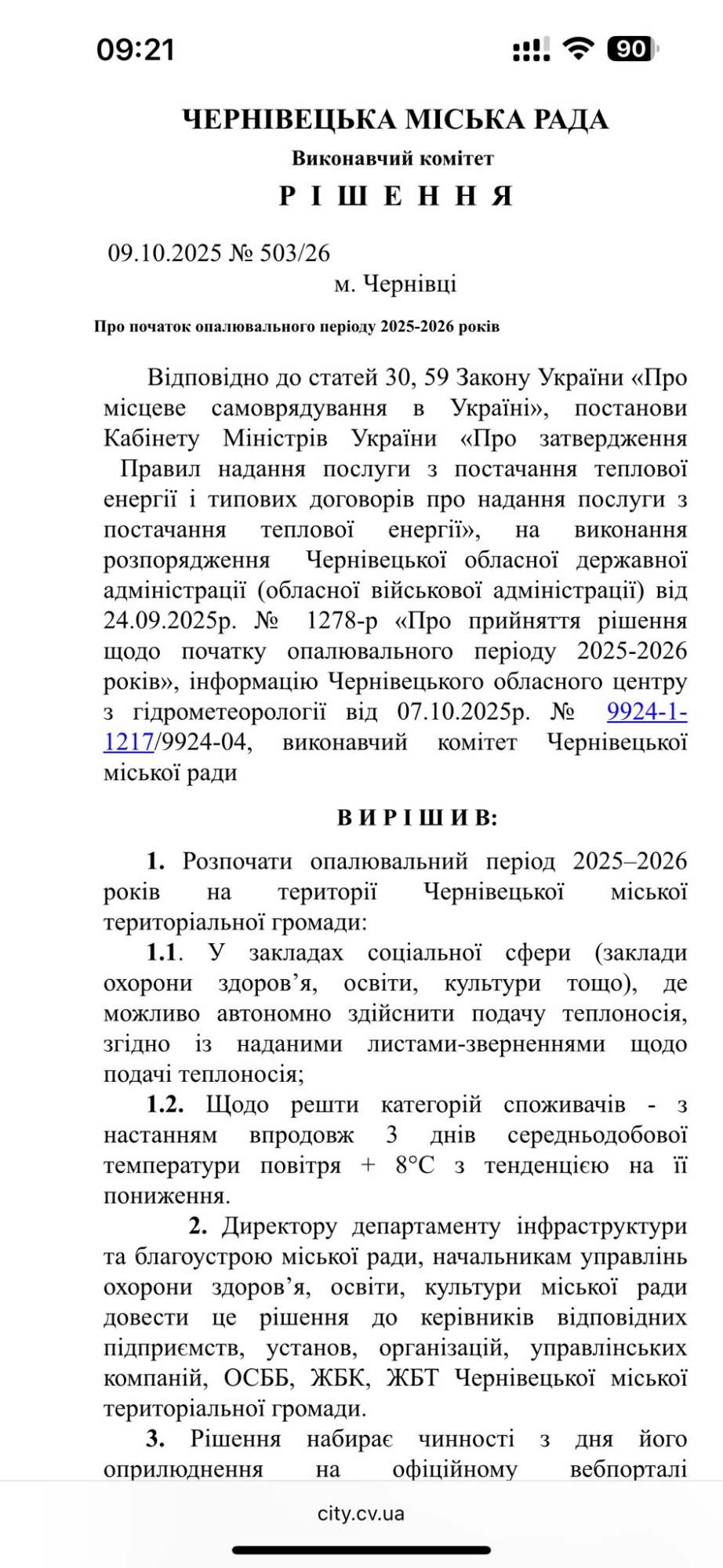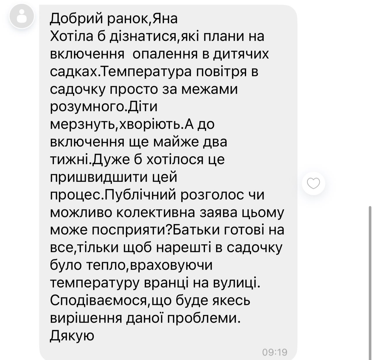 Яна Брус опублікувала також повідомлення від чернівчан про неймовірну холоднечу в квартирах та дитсадках та документи про рішення виконкому міськради щодо початку опалювального сезону.