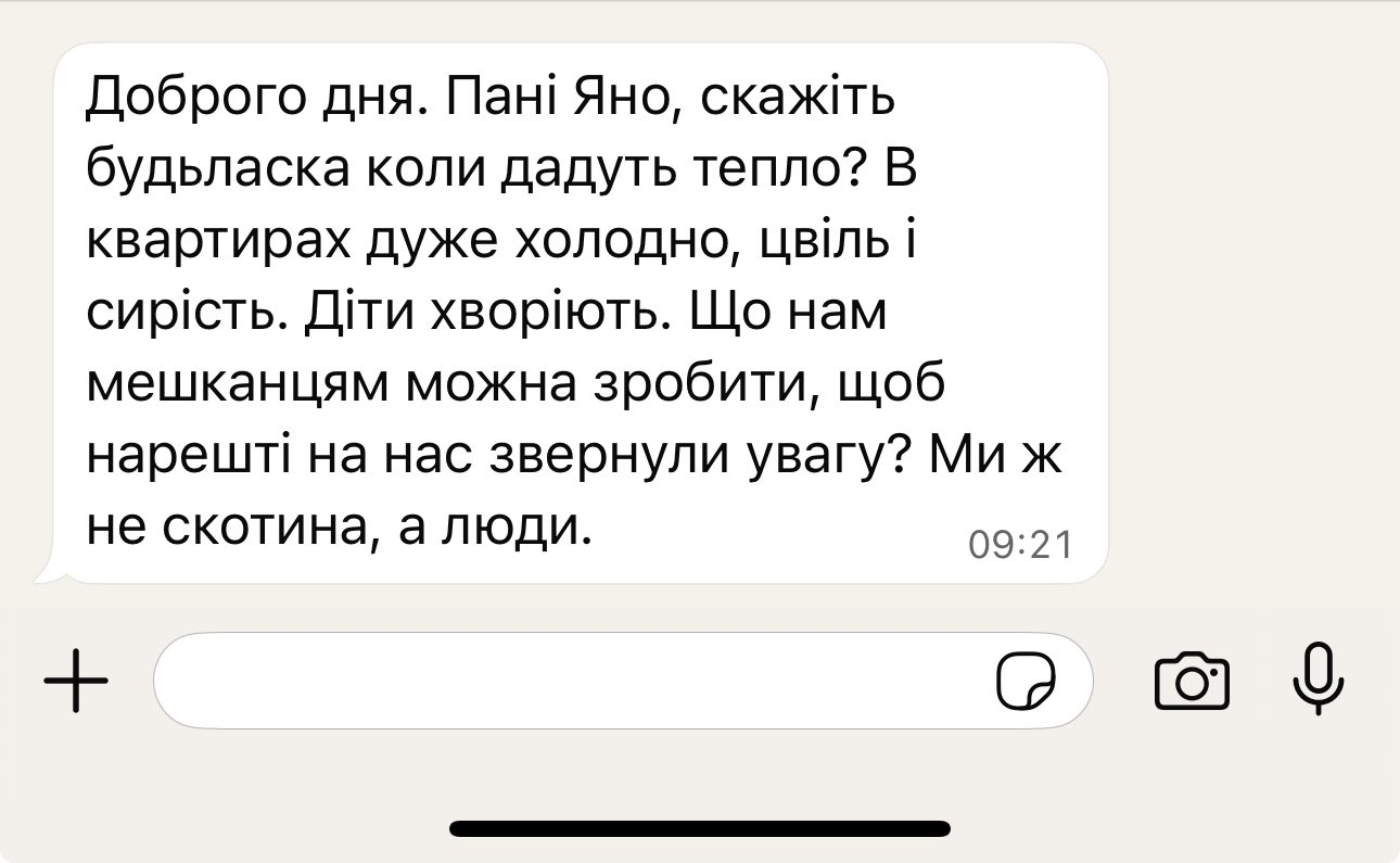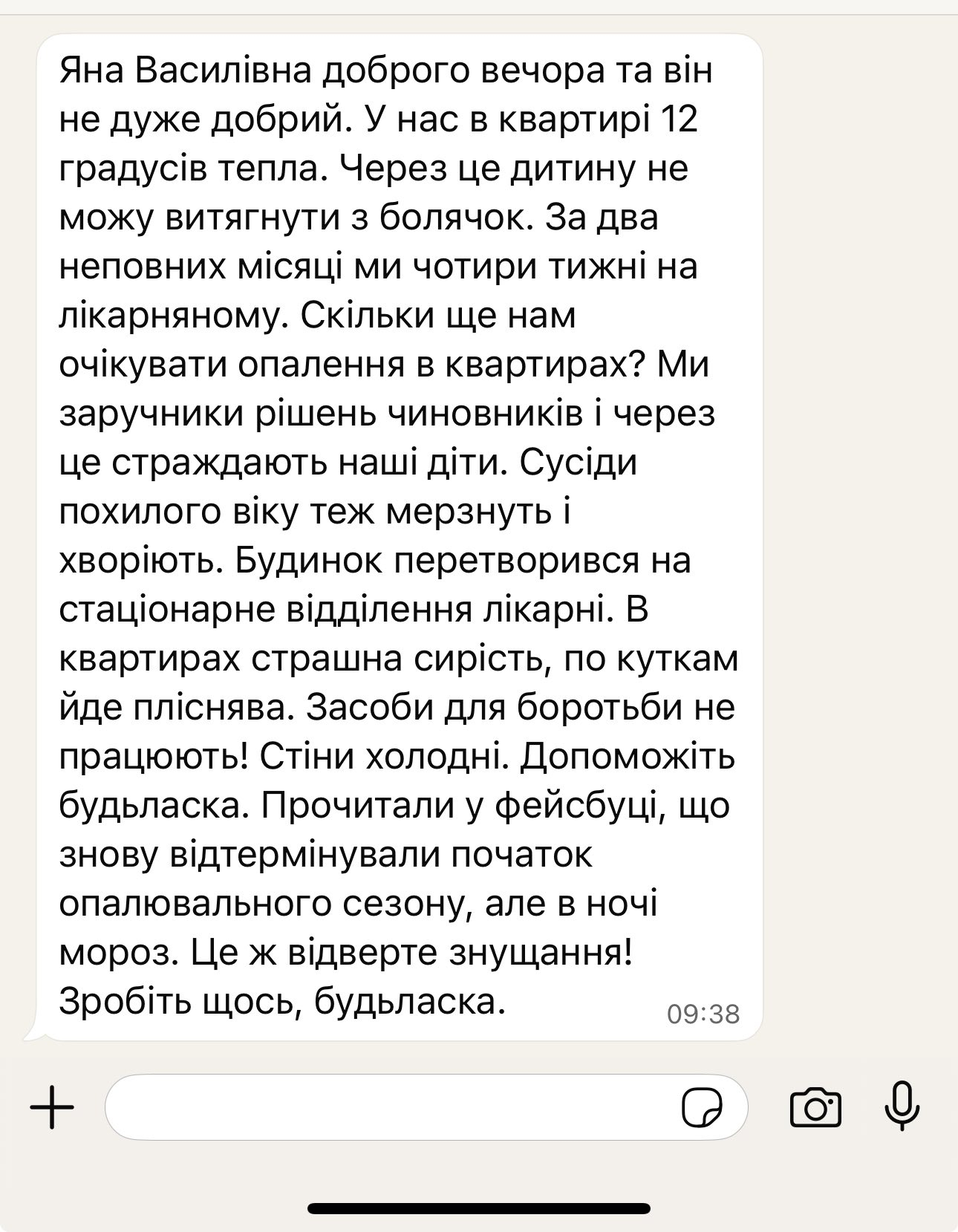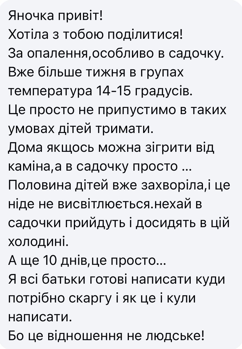 "Чому нема тепла і хто цьому винен? Рішення про початок опалення — є. Звіт мера про початок опалювального сезону - є. А тепла в школах, садочках і лікарнях— досі нема.